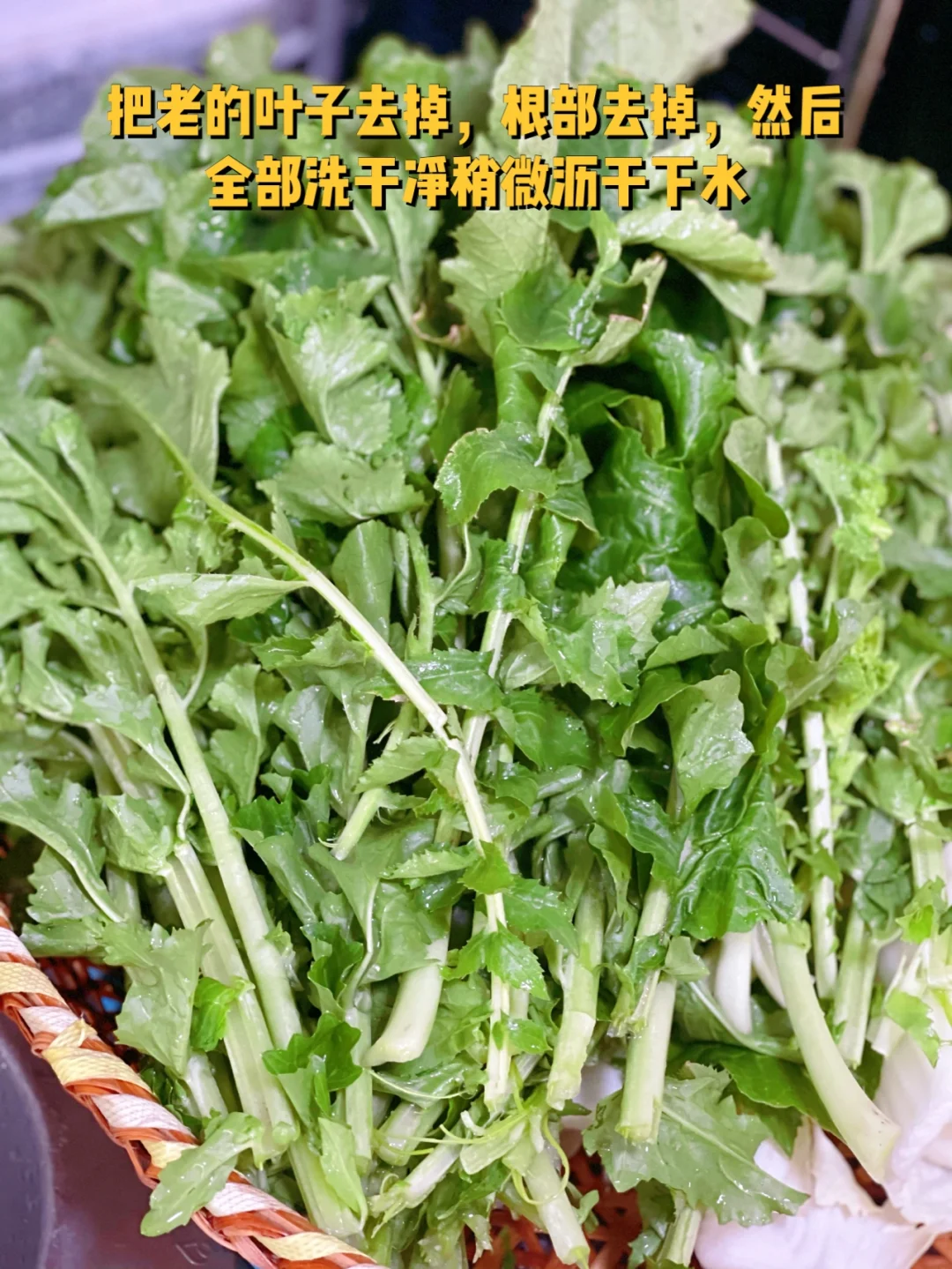 1. 把老的叶子去掉,根部去掉,然后全部洗干净稍微沥干下水