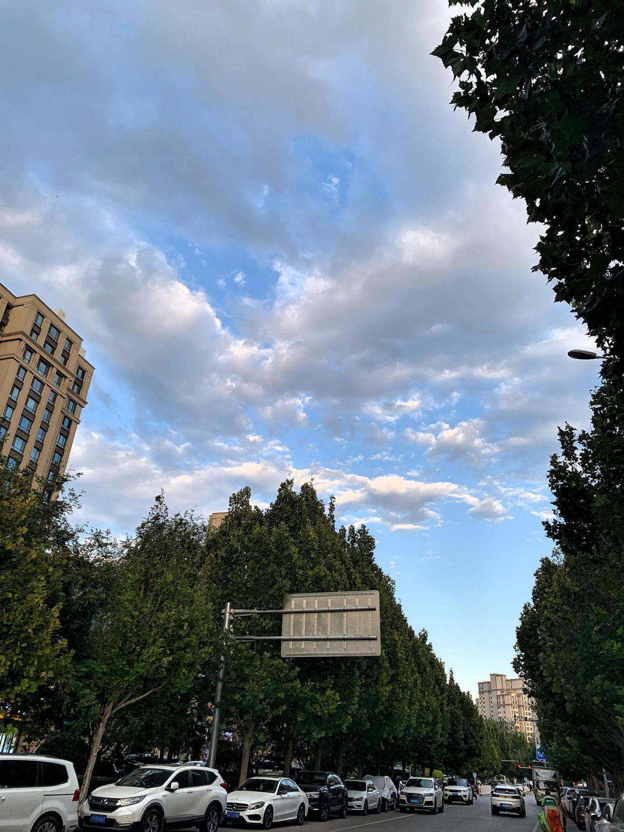 城市的天空,总在不经意间留下温柔笔触。朵朵白云在蓝天的画布上晕开,与街道两侧的绿