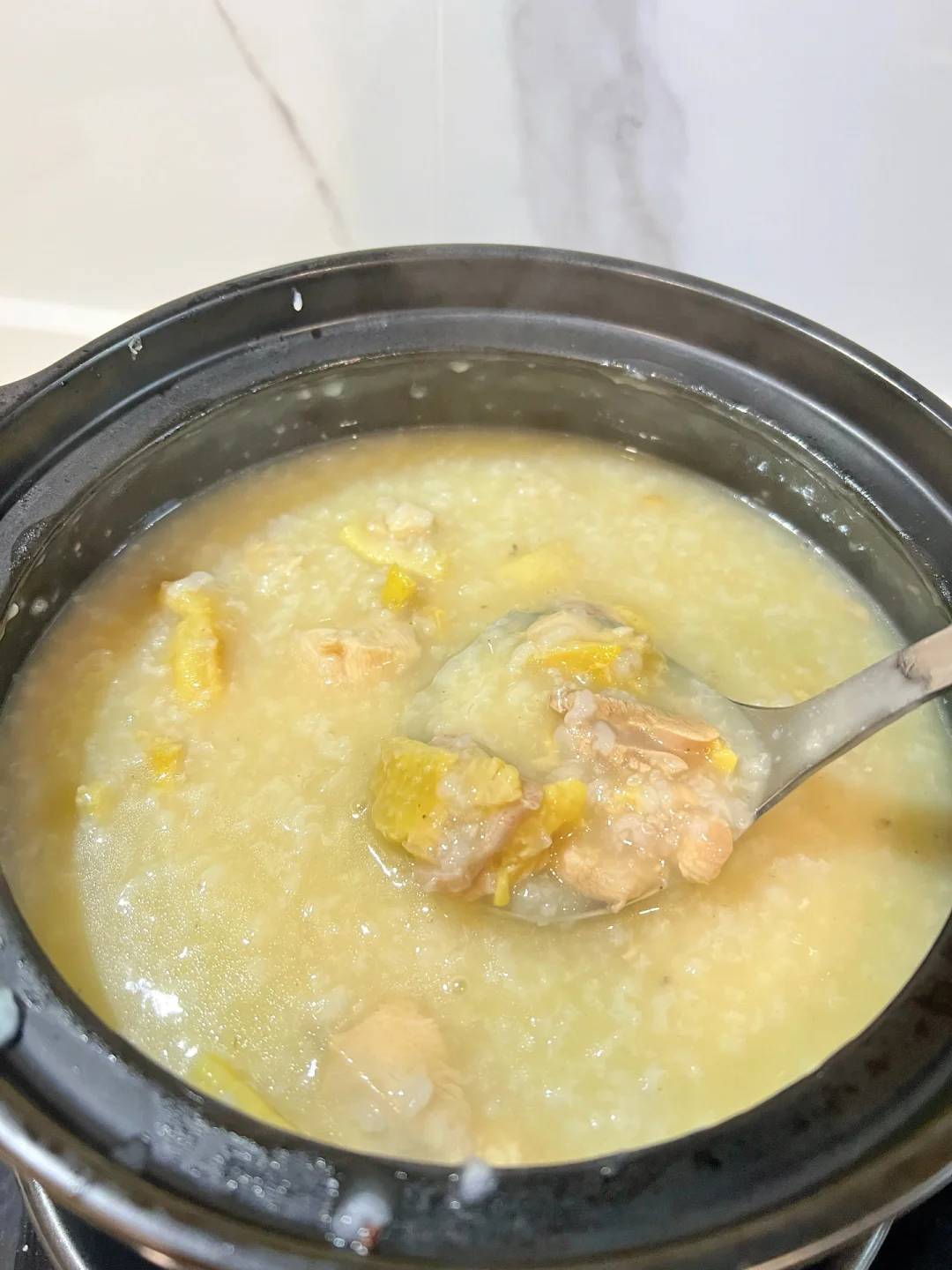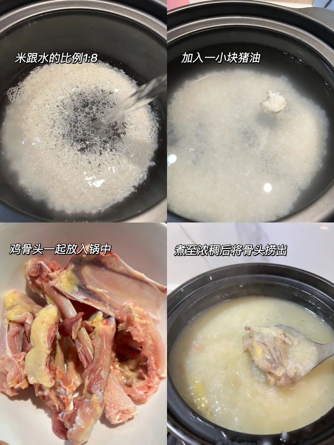 2⃣️大米洗净,加入适量清水,加入鸡骨,大火烧开后小火煮至浓稠。