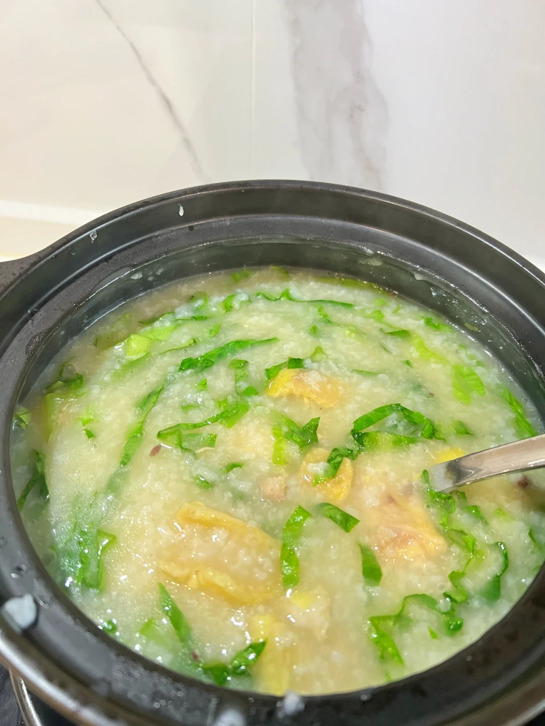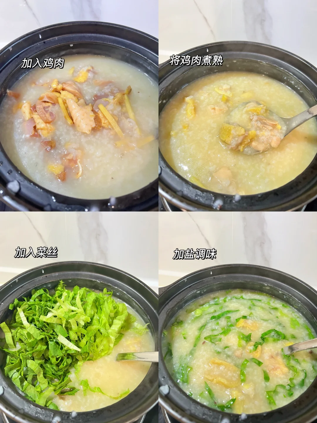 4⃣️粥煮至浓稠后,将鸡骨头捞出,加入腌制好的鸡肉煮至刚好熟透。加入生菜丝,煮开加盐调味即可。