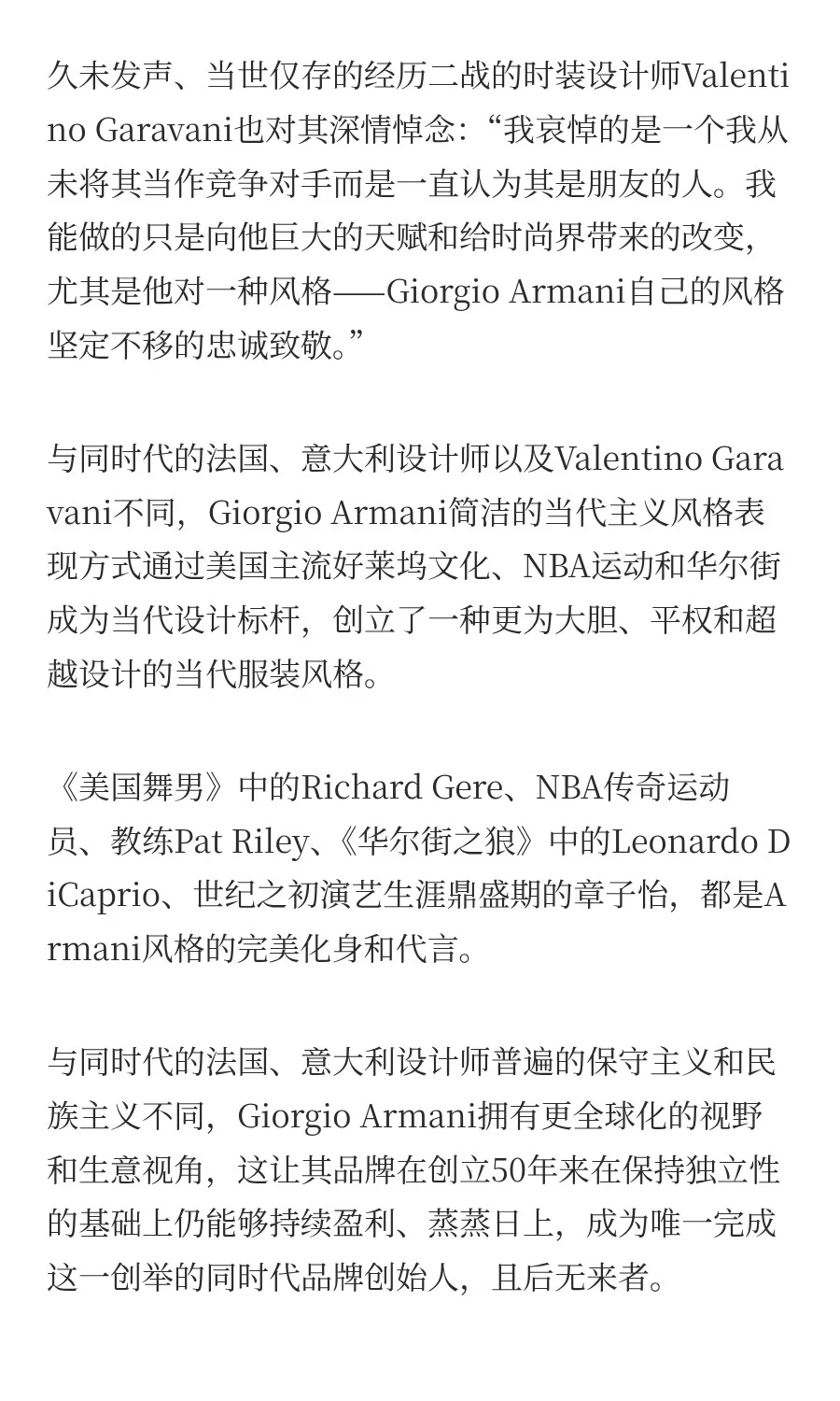 与同时代的法国、意大利设计师普遍的保守主义和民族主义不同,Giorgio Armani拥有更全球化的视野和生意视角,这让其品牌在创立50年来在保持独立性的基础上仍能够持续盈利、蒸蒸日上,成为唯一完成这一创举的同时代品牌创始人,且后无来者。