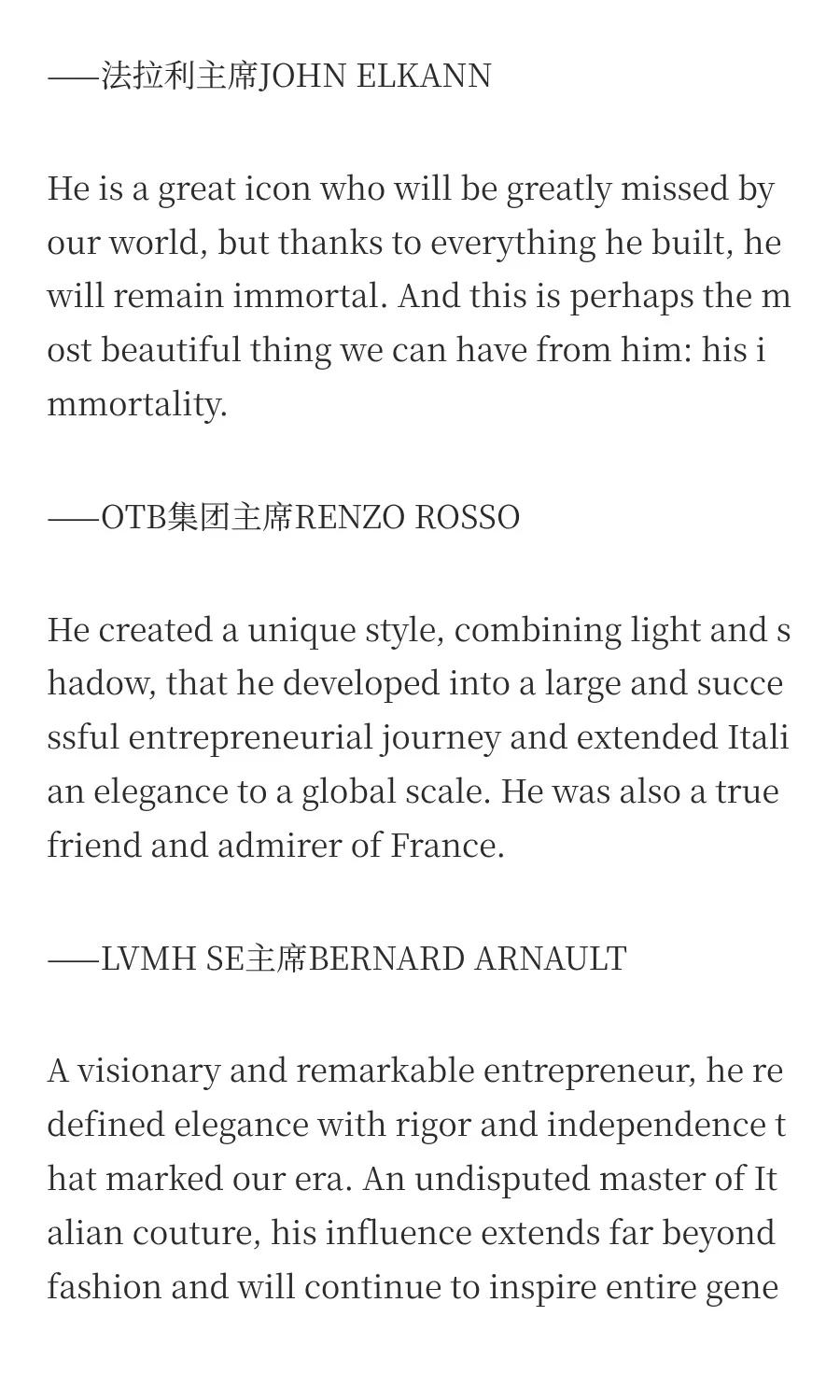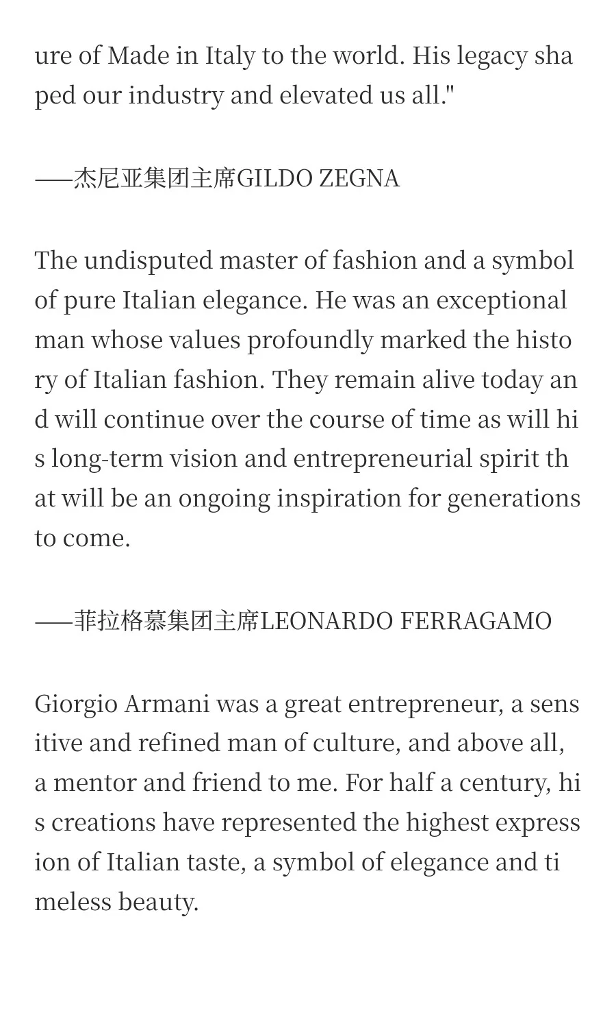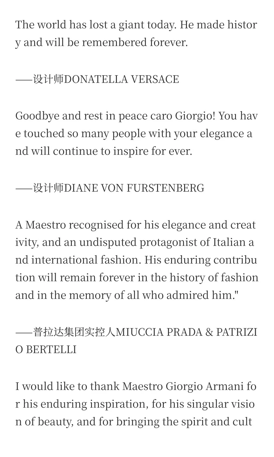 久未发声、当世仅存的经历二战的时装设计师Valentino Garavani也对其深情悼念:“我哀悼的是一个我从未将其当作竞争对手而是一直认为其是朋友的人。我能做的只是向他巨大的天赋和给时尚界带来的改变,尤其是他对一种风格——Giorgio Armani自己的风格坚定不移的忠诚致敬。”