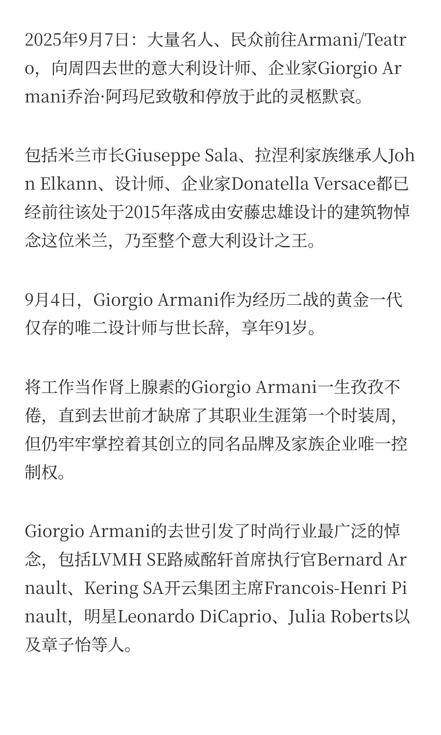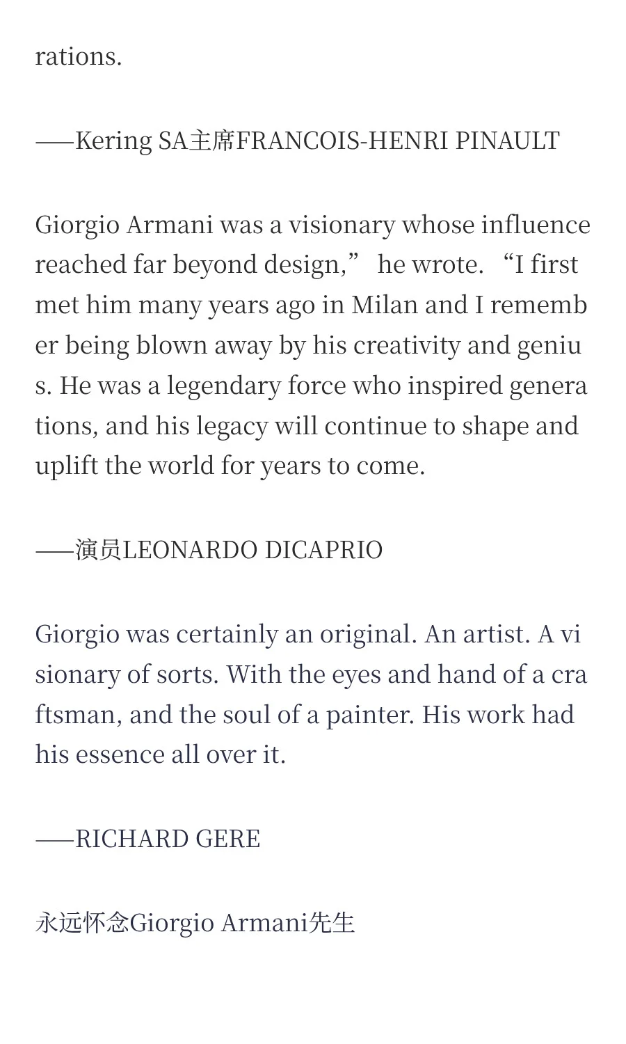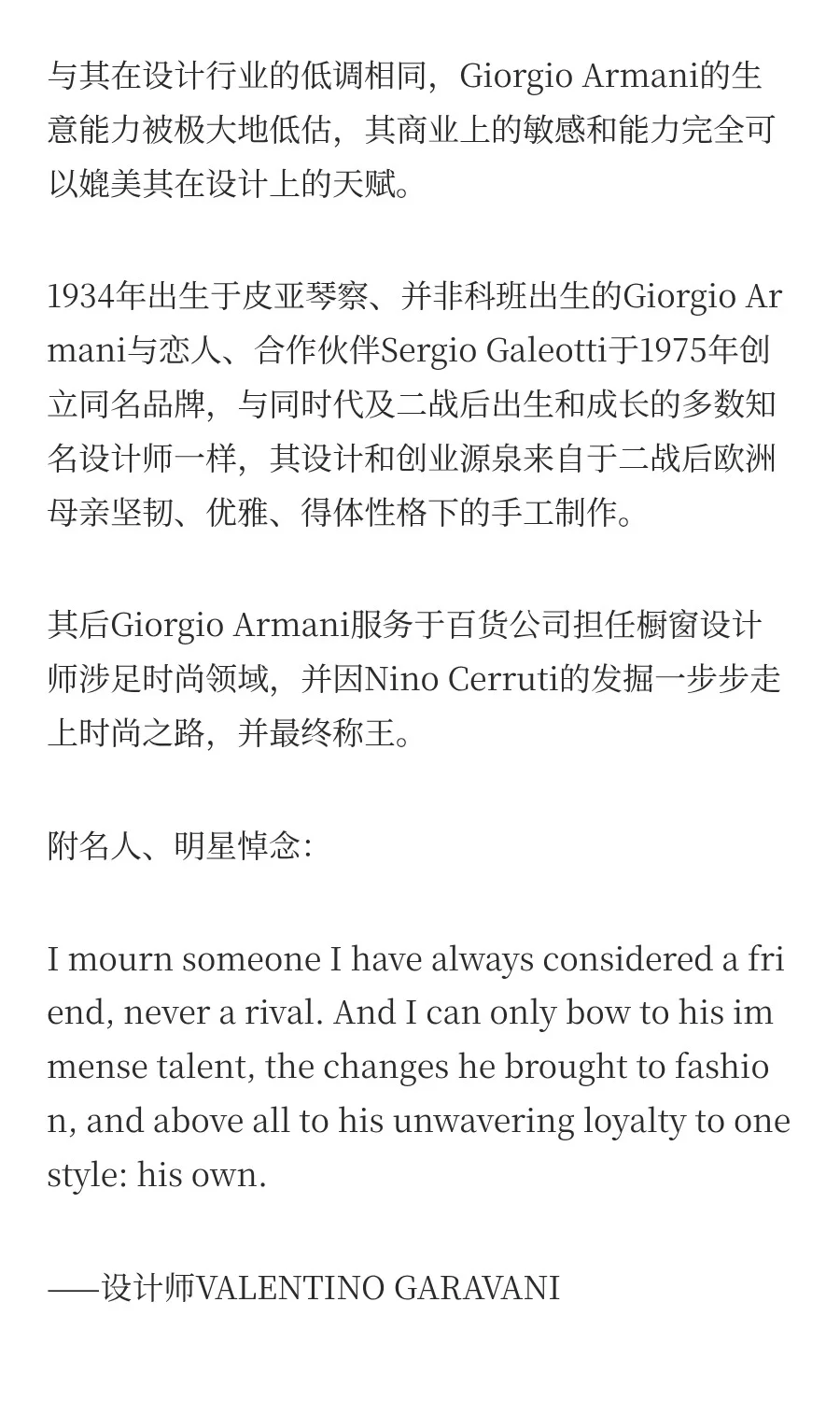 久未发声、当世仅存的经历二战的时装设计师Valentino Garavani也对其深情悼念:“我哀悼的是一个我从未将其当作竞争对手而是一直认为其是朋友的人。我能做的只是向他巨大的天赋和给时尚界带来的改变,尤其是他对一种风格——Giorgio Armani自己的风格坚定不移的忠诚致敬。”