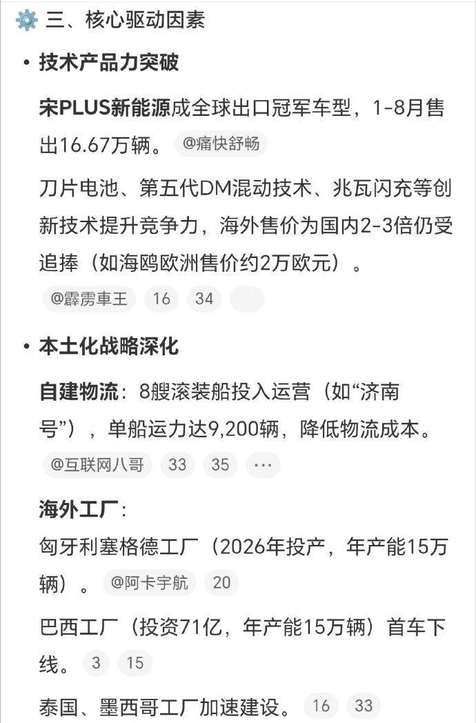 看到大家在讨论比亚迪汽车出口,除了说在国内市场比亚迪很猛,海外市场也确实是非常明