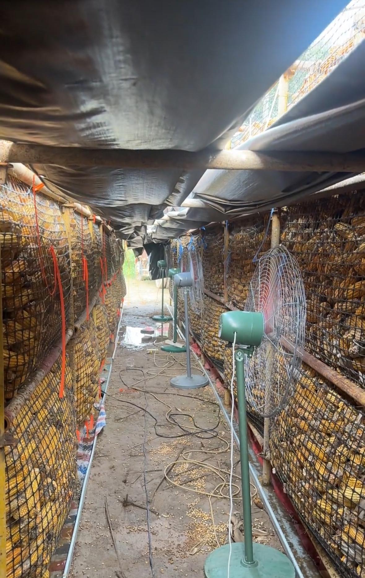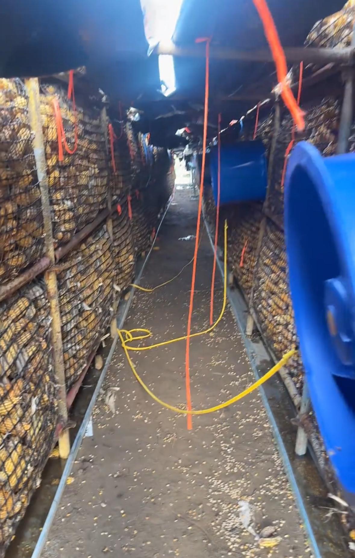 村民自制玉米烘干系统,为避免玉米发芽村民将玉米站好用电风扇给玉米通风,9月份大部分时间都在下雨,玉米收了不能晾干,聪明的村民自搭大棚用多台风扇给玉米通风散热,不过今年的玉米价格并不高,加上前期浇地肥料就落个人工钱甚至赔钱。