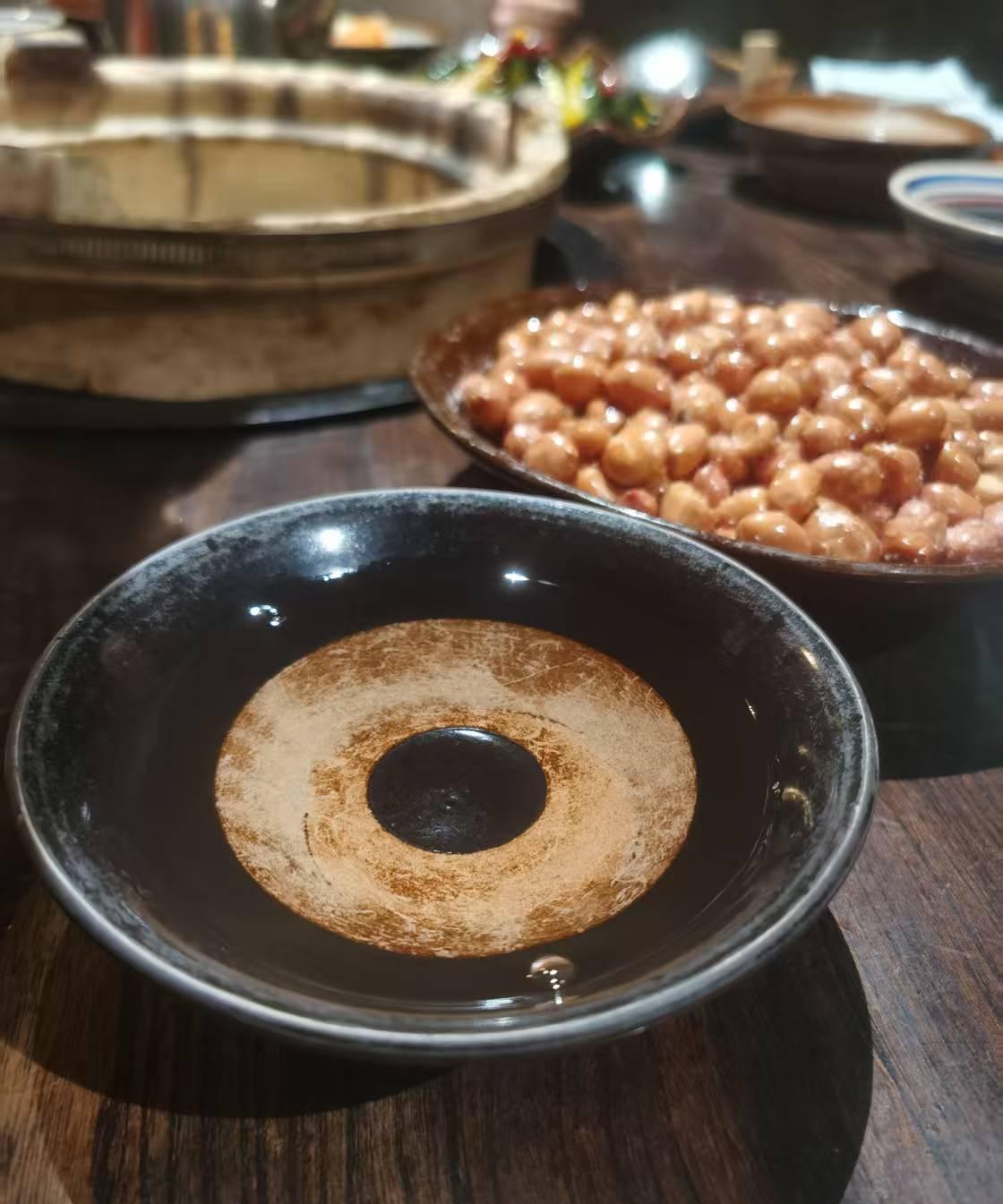 假期里,亲朋好友免不了要吃吃喝喝,昨晚在石家庄又探到一家有特点、没到过的店----老宅吊锅。 此店位于槐安路东段,与辣婆婆和孙掌勺紧邻,招牌不算突出,容易被淹没和忽略。 包间的氛围感十足,泥墙、木桌、长板凳,暖光之下,很有年代感。 吊锅的精髓在于文火慢煨,初看上去似乎不太雅观,但食材香气逼人,适合细嚼慢咽,围炉畅聊。 四个人点了一个价格适中的松茸鸡锅,198元。怕上火,没点招牌的鸳鸯锅,那种更贵,228元。 松茸鸡锅一副很有营养的样子,各种菌菇和鲜嫩的鸡肉炖在一起,口齿留香。又点了花生米和拍黄瓜等四样下酒菜,够了。 餐桌上的辅料挺有意思:蘸料根据个人喜好,可用可不用,内容和涮火锅一样;店家提供的免费老鹰茶别有味道,有一股泥土的苦涩感;餐巾纸也是特制的,黄金万两,擦嘴舍不得啊...... 注意:这里不提供任何酒具,不管白的、红的、啤的,都用这种茶碗招呼,有武松的感觉。 @牛柄膳杬,分享有价值的感悟