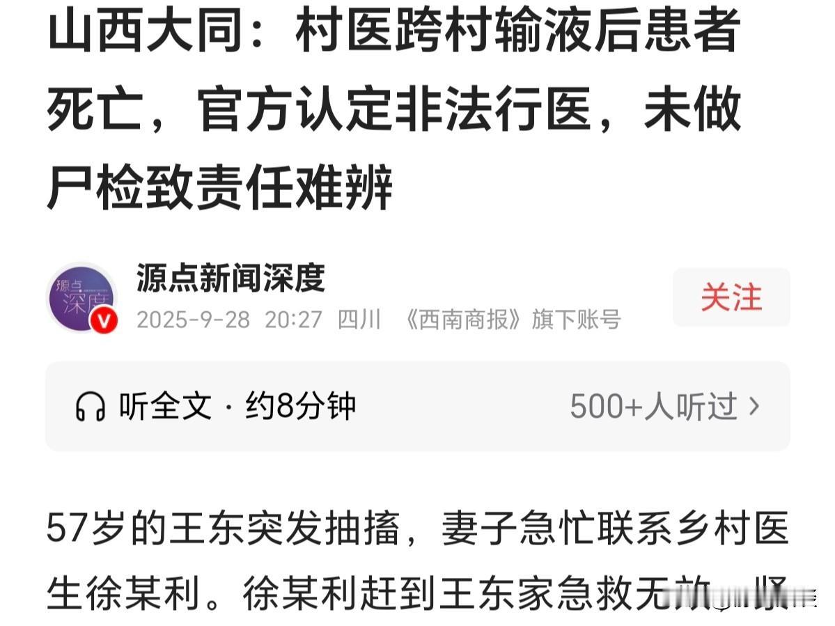 山西大同,男子是村医,突然接到邻村亲戚的电话,说他胃疼的老毛病又犯了,让男子过去给他看看,男子二话不说,火急火燎赶过去,按照病人家属拿出以前的药方,男子麻利地配好药,看着输完液就回家了,没想到亲戚输完液后离世。家属操办完后事,不干了要求男子赔偿38万,双方没谈拢,亲戚的儿子把男子举报了,称他非法行医。 一场意外,两败俱伤,患者丢了性命,村医没了饭碗,两家亲戚彻底成了仇人。 事情要从2024年12月说起。那天天刚蒙蒙亮,王某凌晨3点多就肚子疼得受不了,躺也不是坐也不是。 他平时就有胃疼的老毛病,大冷天半夜三更也不好意思叫医生过来,好容易挺好7点来钟,实在受不了,就给邻村徐某打电话,让他过来给自己看看。 徐某是村医,两家拐弯抹角有点亲戚,但两家走的挺近。 徐某接到电话,早饭都没顾上吃,背起药箱就跑过去了。 不到八点就到了王某家。王某家人赶紧拿出之前在别处开的药单,上面都是些营养药和胃药。 徐某简单问了问情况,看了看单子,就给王某挂上了点滴。 输液的时候,王某脸色看着好了点。输完液,徐某又观察了几分钟,见没什么不良反应,嘱咐了家属几句就回去了。 没想到中午不1点,徐某正在家休息,王某妻子的电话就打过来了,哭着喊着说让他快来,老王快不行了! 徐某也吓坏了,抓起药箱就往外冲,等他赶到时,王某已经没意识了。 他赶紧做心肺复苏,同时让家人打120。拉到医院人还是没救回来。 好好的一个人,就是犯了老毛病,也不至于就没了,难道是跟打点滴有关? 王某的儿子当时就不答应,要找徐某算账,可王某的妻子和哥哥横拦竖挡不让儿子找。 她们觉得两家有亲戚关系不错,平时有个头疼脑热徐某没少帮忙随叫随到。 发生这样的意外也不好翻脸就认定是徐某的责任。最后也没做尸检,就按照当地习俗,稀里糊涂把人安葬了。 徐某心里也不好受,王某的儿子更咽不下这口气,安葬完父亲就找到徐某,这事总不能当没发生吧? 今年年初,两家坐下来商量,大家心情都不好,那毕竟是一条命,王某儿子提出38万的赔偿。 徐某当时义气用事,没反驳就算默认了,可现实问题摆在眼前,他家庭困难,根本没钱。 徐某就是个普通村医,对人实诚,从不多收钱,有时小钱还不好意思要,收入微薄,家里还有老人孩子要养,哪拿得出这么多钱? 他想跟对方商量分期支付,可这个提议让本就悲痛的家属难以接受,双方矛盾一下子就激化了。 后来几次协商,气氛一次比一次紧张,后来村里有头有脸的人出面说和,他家确实没钱,赔偿金额从38万,降到20万。 就算20万,对徐某来说也是天文数字,最后徐某只同意付一部分,最后他说只能承担3万的丧葬费。 这个数字离王某家属的预期太远,协商彻底破裂。 今年7月底,走投无路的王某儿子,把徐某举报了,说他非法行医。 调查结果很快出来:徐某跨村行医,违反了《乡村医生从业管理条例》。最终,他的执业执照被吊销,还被罚款3.2万。 王某没了命,徐某丢了工作,背上罚款,还和亲戚反目成仇,未来的日子一片迷茫。 直到最后,也没人能说清楚:王某的死到底是不是输液导致的? 如果当时做了尸检,结果会不会不一样?徐某的行为,到底该负多大的责任呢? 《乡村医生从业管理条例》:虽然文本中未明确提及具体条款,但根据相关规定,乡村医生应在注册的村医疗卫生机构从事预防、保健和一般医疗服务。 徐某早些年就考取了村医资格证,但规定他只能在自己注册的那个村里行医。 如果他去了别的村子,或者在不属于他注册的医疗机构里看病,那就可能被算作非法行医了。 徐某跨村为王某进行诊疗,因此违反乡村医生执业地点的规定。 《民法典》第1218条:患者在诊疗活动中受到损害,医疗机构或者其医务人员有过错的,由医疗机构承担赔偿责任。 如果徐某在诊疗过程中存在过错,如未按照规范进行诊断、治疗,或者在用药、输液等环节存在失误。 且其过错与王某的死亡存在因果关系,那么徐某作为村医,可能需要承担相应的赔偿责任。 王某死亡后,家属未进行尸检,导致无法确定王某的死因是否与徐某的诊疗行为有关,这事成了糊涂账。 徐某是出于一片好心。看在和王某是亲戚关系,对方求助,他二话不说就赶过去,这份人情和责任心是有的。 但从法律上讲,他确实违规了,跨村行医就是踩了红线,这一点是板上钉钉的。 这件事里最让人无奈的,如果当时做了尸检,也许就能搞清楚死因。 这样一来,责任划分就明确了,赔偿问题也能有个更公正的依据。现在责任也说不清,两家亲戚变成了仇人。 所以,无论关系多好,无论出发点多善良,在涉及专业和法律的事情上,一定要守住底线。 人情是人情,规矩是规矩,混淆了就容易出大问题。 对此,你怎么看呢? @静心法谈 学法辨是非,慬法不吃亏。