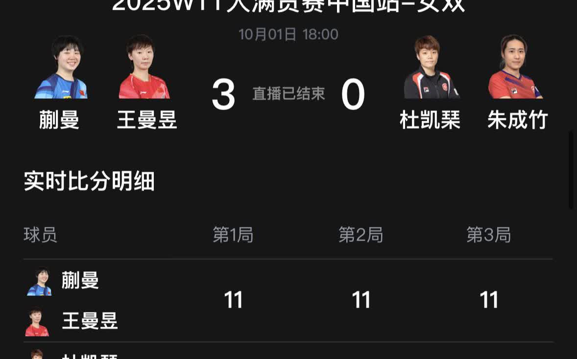 刚刚看完蒯曼王曼昱女双,最后虽然赢了但是蒯曼真的是个雷,粘球就丢,王曼昱得一分她