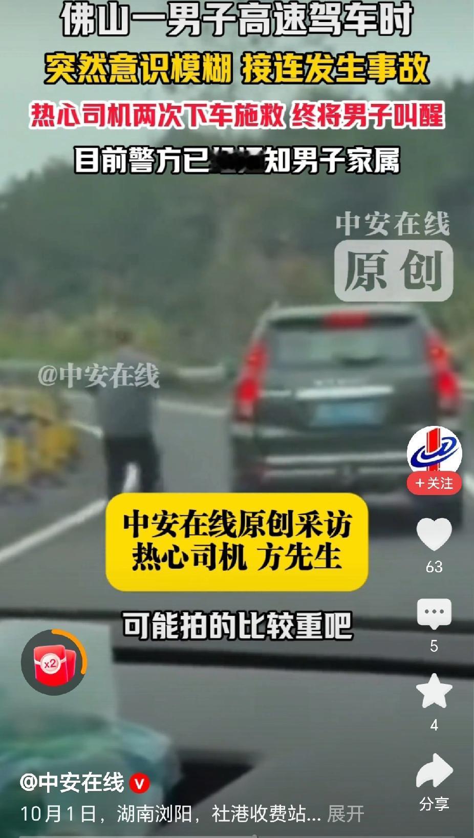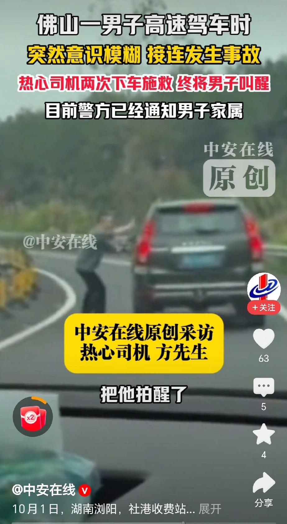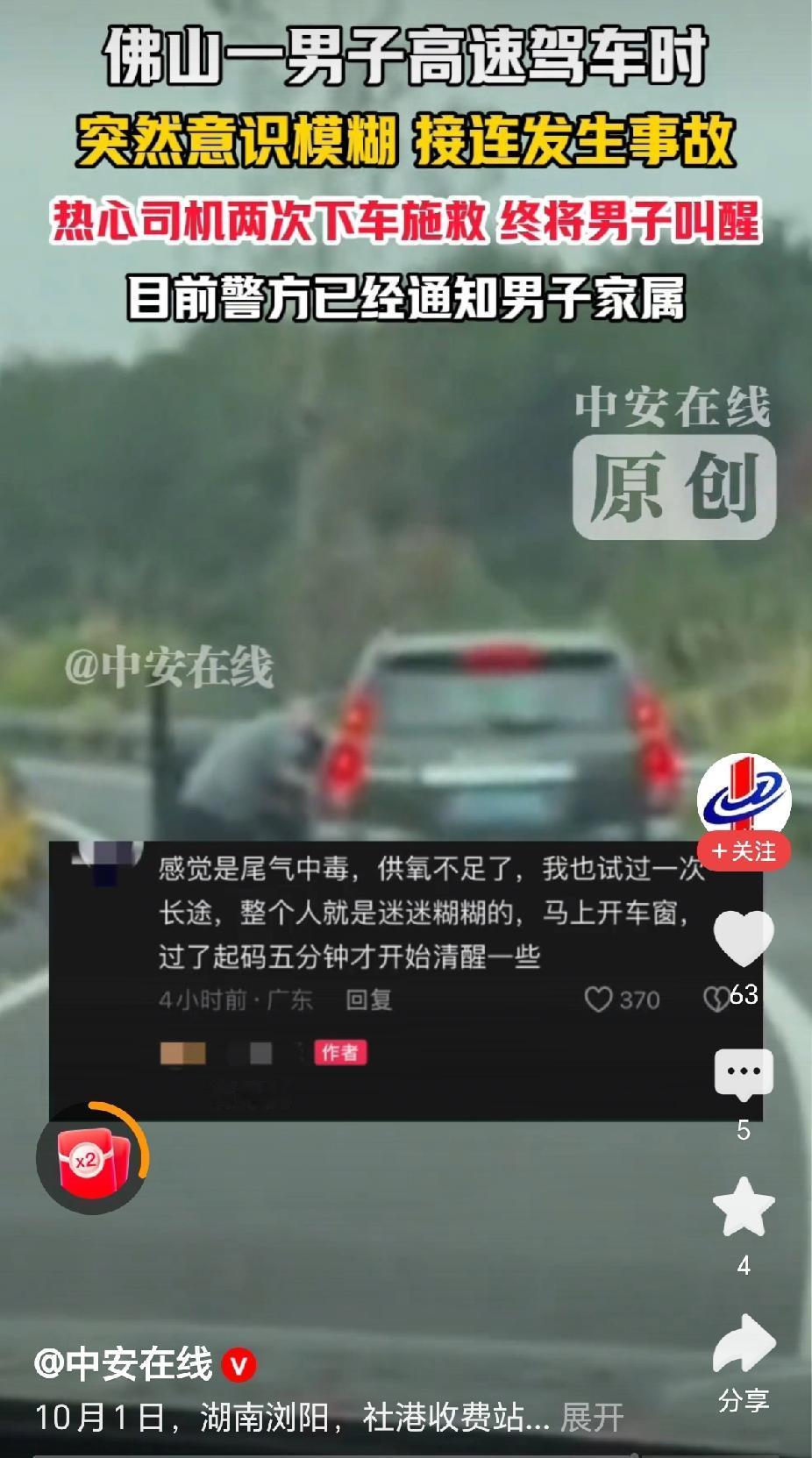 “热心了,高速路上发现危险驾驶情况,司机方先生两次下车施救!”10月1日,湖南浏阳社港高速路段,佛山一男子驾驶车辆在高速上接连发生事故,还好被热心司机唤醒!(来源:中安在线) 据报道,国庆节这一天,方先生驾驶车辆,行驶在武深高速公路上,发现前方一辆广东牌照的车辆摇摇晃晃,车速很低,不断的撞向旁边的围栏。 “这不对劲,非常危险。”方先生接受采访时说,需要过去将驾驶员唤醒,赶紧停车!方先生下车去看时,前方车辆已经撞了好几个地方。 “赶紧停车,赶紧停车,别开了,非常危险!”方先生使劲的拍打车门,还好将驾驶员唤醒靠边停车。 “突然意识模糊,象中毒了一样。大脑不受控制,接连发生了事故!”佛山司机后来说道,感觉是尾气中毒,供氧不足。 “救人一命,积善行德!”有网友说,高速公路上两次上前施救确实需要很大的勇气,对自身的威胁也是比较大的挑战,为救人的热心师傅点赞! “身体不好,还是不要开车上高速为好!”有网友评论说,看这位佛山的司傅瘦骨嶙峋,身体状况不太好,应该为自己负责,也为他人的安全负责! 是呀,在高速公路上开车,如果是车的状况不好,或自己的身体素质不好,确实容易出现事故,需要好好的把握。 在高速公路施救,也需要注意方式方法,比如放置停车墩等,将自己的车辆打下双闪,提示后,车前面车辆有故障! 对此,你的看法是怎样的呢? 高速行车遇突发事故该咋办 @秋实99 关注人生冷暖,拥抱幸福生活!