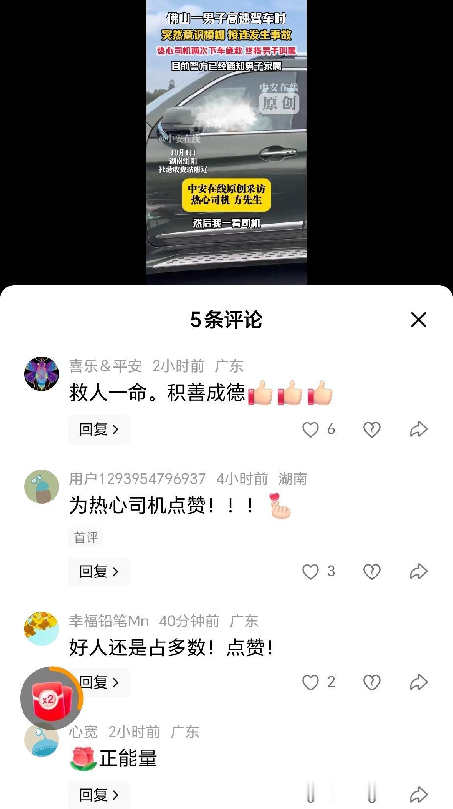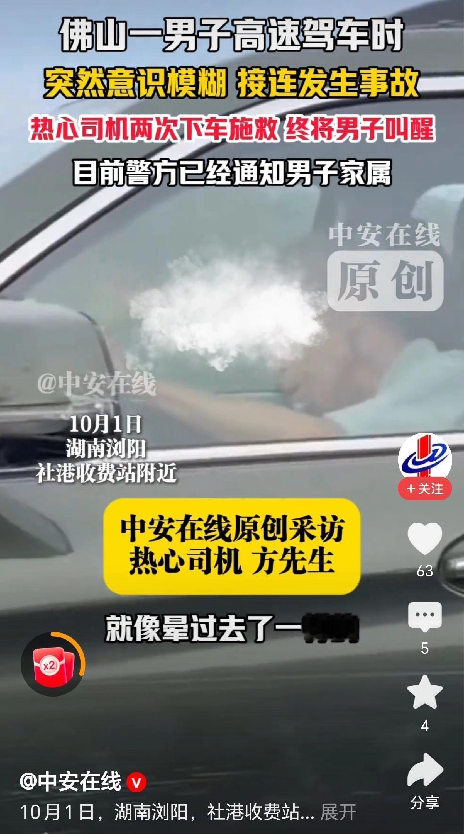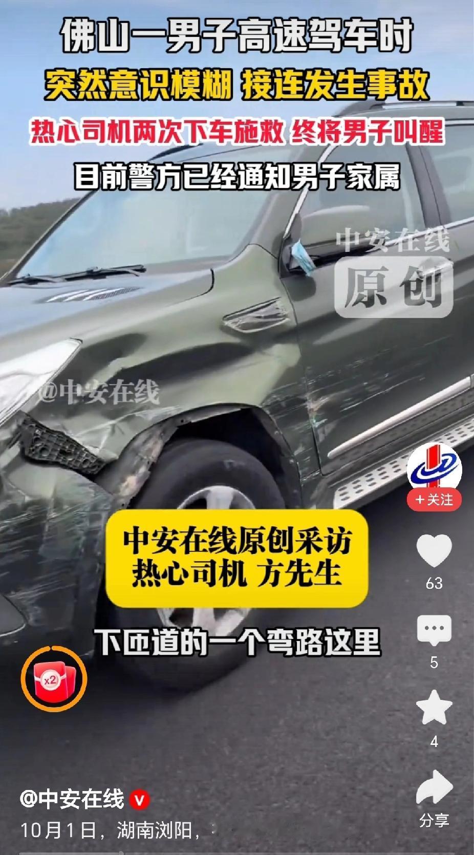 “热心了,高速路上发现危险驾驶情况,司机方先生两次下车施救!”10月1日,湖南浏阳社港高速路段,佛山一男子驾驶车辆在高速上接连发生事故,还好被热心司机唤醒!(来源:中安在线) 据报道,国庆节这一天,方先生驾驶车辆,行驶在武深高速公路上,发现前方一辆广东牌照的车辆摇摇晃晃,车速很低,不断的撞向旁边的围栏。 “这不对劲,非常危险。”方先生接受采访时说,需要过去将驾驶员唤醒,赶紧停车!方先生下车去看时,前方车辆已经撞了好几个地方。 “赶紧停车,赶紧停车,别开了,非常危险!”方先生使劲的拍打车门,还好将驾驶员唤醒靠边停车。 “突然意识模糊,象中毒了一样。大脑不受控制,接连发生了事故!”佛山司机后来说道,感觉是尾气中毒,供氧不足。 “救人一命,积善行德!”有网友说,高速公路上两次上前施救确实需要很大的勇气,对自身的威胁也是比较大的挑战,为救人的热心师傅点赞! “身体不好,还是不要开车上高速为好!”有网友评论说,看这位佛山的司傅瘦骨嶙峋,身体状况不太好,应该为自己负责,也为他人的安全负责! 是呀,在高速公路上开车,如果是车的状况不好,或自己的身体素质不好,确实容易出现事故,需要好好的把握。 在高速公路施救,也需要注意方式方法,比如放置停车墩等,将自己的车辆打下双闪,提示后,车前面车辆有故障! 对此,你的看法是怎样的呢? 高速行车遇突发事故该咋办 @秋实99 关注人生冷暖,拥抱幸福生活!
