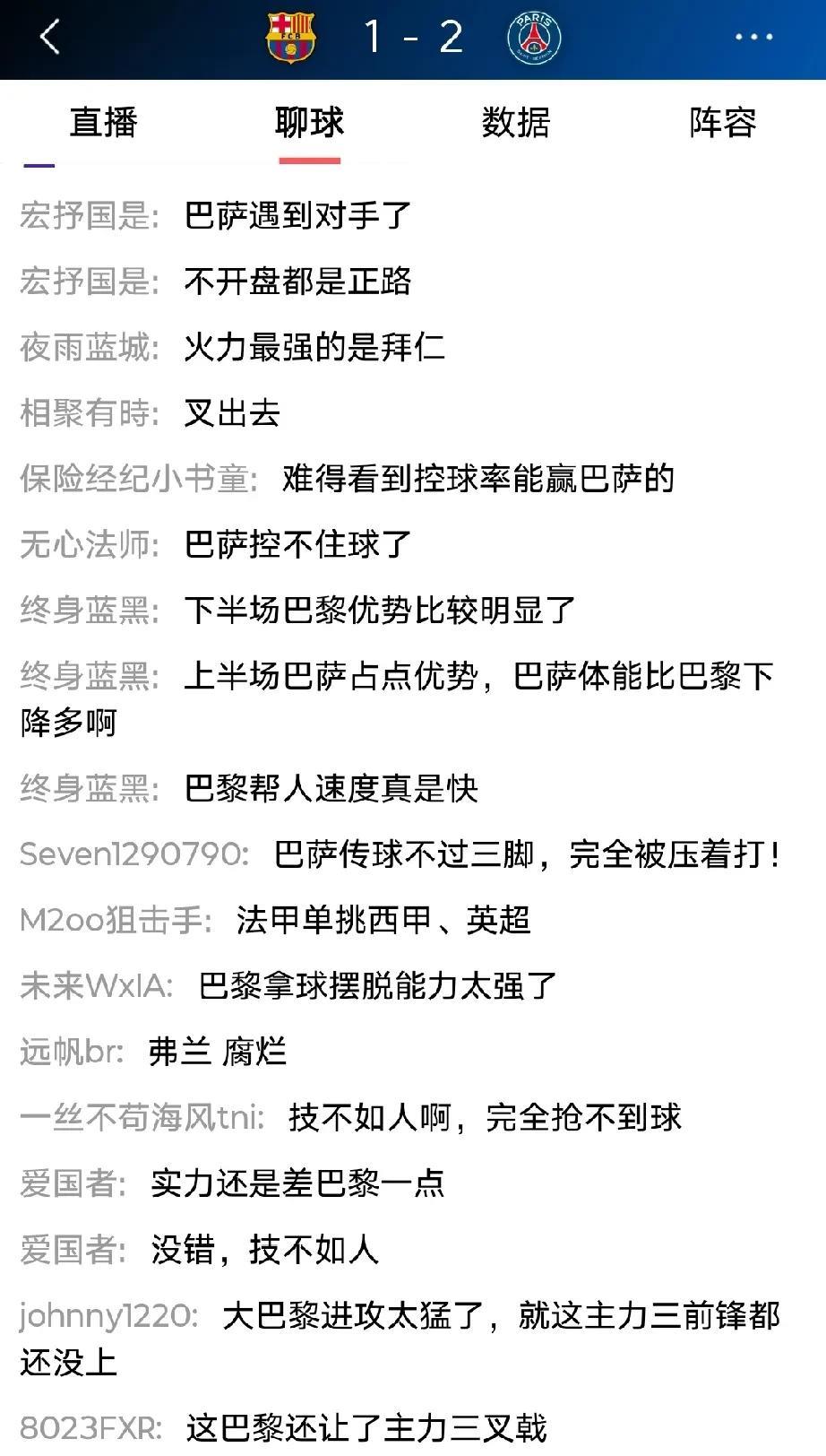 欧冠巴萨也被大巴黎压制住了,主场1-2不敌对手。上赛季在国米欧冠输球,嗷嗷叫着还