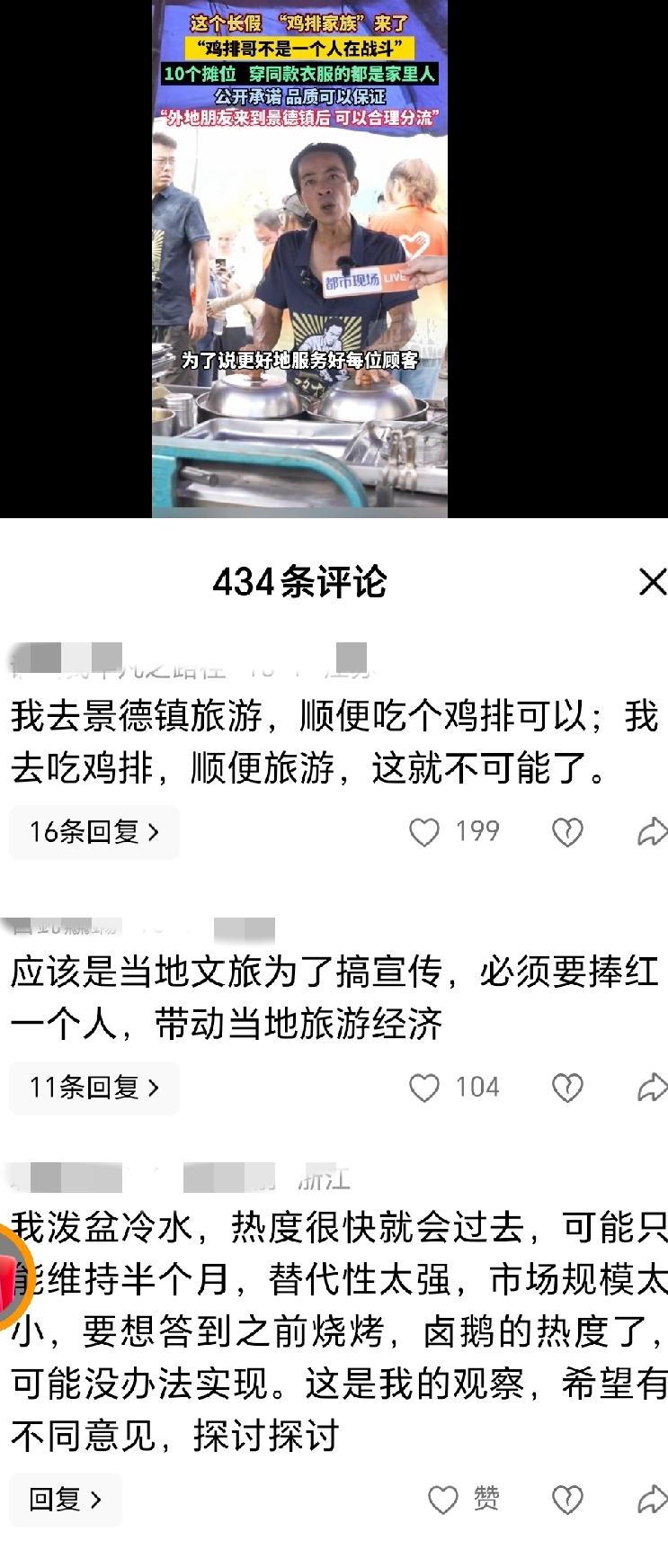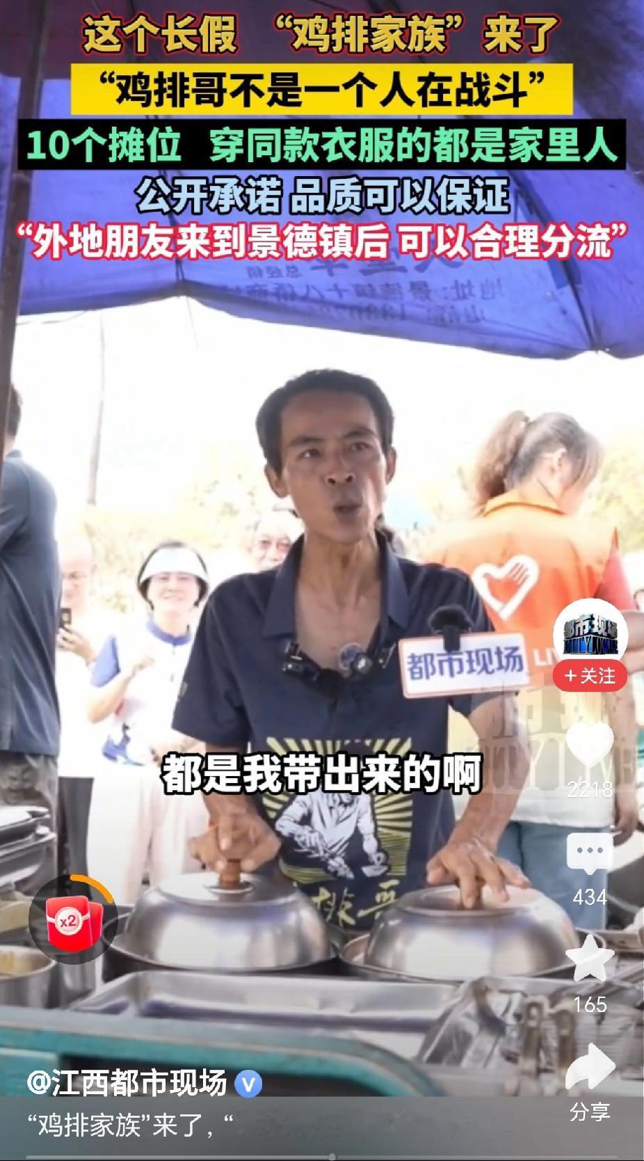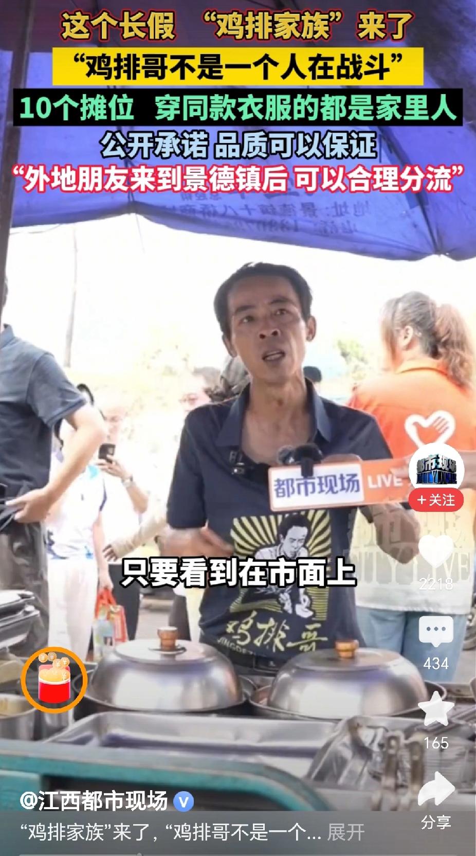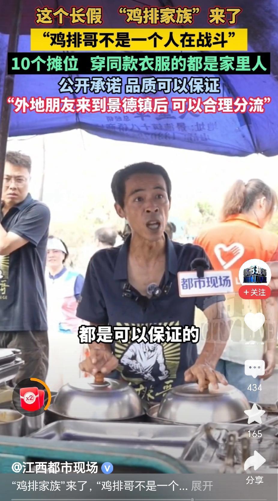 “分流了,这个假期。鸡排哥不是一个人在战斗!”近日,江西景德镇,随着鸡排哥走红,全国各地到景德镇旅游的游客都往鸡排哥那里去了!(来源:@江西都市现场) 据报道,国庆假期的第一天,鸡排哥的生意太火爆了,忙得脚不着地,脸上的笑容也没有了,金句也少了。有网友说,“买鸡排的情绪价值不见了!” 为了应对这个火爆的场面,鸡排哥向媒体说:“这个假期不是我一个人在战斗,鸡排家族现在有十个人,不同的地方出摊!” “只要看到市面上,看到有我这个logo的T恤,他们都是我带出来的,质量都是可以保证的!”鸡排哥面对媒体介绍说。 “外地的朋友来到景德镇后,如果想吃鸡排,可以合理的分流。穿同款衣服的的是家里人。”鸡排哥希望能够分流一些热情的游客。 “我去景德镇旅游,顺便吃个鸡排可以;我去吃鸡排,顺便旅游,这就不可能了。”有网友评论说,去了景德镇,可以考虑找鸡排,哥吃个鸡排。 “热度可能半个月就过去,这个鸡排的市场需求还是太小了,要达到烧烤卤鹅的热度可能不太现实。”有网友说,这个大家可以探讨。 在我看来,一个地方要出圈,确实需要推出或发现满足市场需要的现象级人物,人们能够找到情绪和价值的共鸣。 但是要维持市场的热度,确实挺难的,因为可替代的产品和替代的人太多了。比如去年怀化的李晓华,今年就没什么热度了;还有开封的王婆,也不见踪影了。 这个现象确实值得各地思考,从老百姓的角度出发,让本地的人们更多的享受便捷的服务,安全的食品。 对此,你的看法是怎样的呢? 如何看待鸡排哥的真诚和坚持 这届消费者为何偏爱“鸡排哥” @秋实99 关注人生冷暖,拥抱幸福生活。