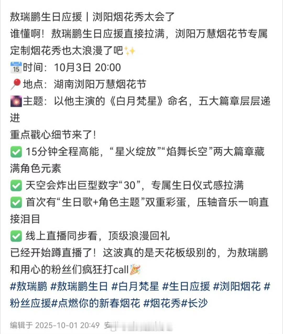 敖瑞鹏在自己生日当天给粉丝准备了烟花秀逆应援,好浪漫的回礼。[捂嘴哭][捂嘴哭]