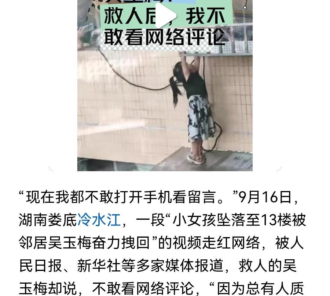 太心寒了!湖南娄底,女子发现一个坠楼的女孩,赶紧奋力拽住,虽然叫了儿子报警,但她觉得民警肯定没有邻居来得快,于是要儿子发了视频发到小区群求救,结果却被质疑这么做耽误救援时间,还有一些不友好的评论,女子都不敢看手机留言。 9月16日,吴女士在厨房煮玉米,突然听到门口砰的一声,她赶紧跑过去查看,看到一个小女孩在她楼下13楼的雨棚上面,她赶紧来到防盗网伸手去拉。 原来这个小女孩才4岁多,她是从20楼摔下来的。 虽然吴女士拉住了女孩,可她害怕自己手滑让女孩再次遇到危险,她赶紧让儿子报警。 吴女士觉得民警怎样都要一点时间,万一自己撑不住女孩该怎么办,她认为警察肯定没有邻居来得快,于是又让儿子录视频向小区群里喊话求救。 吴女士非常的担心,她当时手非常的疼,而且因为紧张手都出汗了,她都要撑不住了。 可同是身为母亲的吴女士深知孩子对一个母亲意味着什么,她当时只想着一定不能让女孩出事,于是咬牙坚持着,忍受着疼痛。 正当她快撑不住的时候,邻居曾先生出现,吴女士说自己撑不住了,他就接过吴女士拉住女孩。 吴女士双手得到解放,她直接瘫坐在地上,发现手脚都没有什么知觉了。 随后鞠先生也敢来帮忙,最终在民警、消防共同努力下,女孩成功得救。 女孩得救,吴女士才松了一口气,整个过程都在极度的紧张中度过。 她当时救人的时候,什么都不想,一心救人,做了自己认为快速救下女孩的行为。 然而,当她救女孩时,让儿子录视频求救的视频引起了一些人的质疑。 有人觉得女子救人竟然还录视频,这不是耽误救援时间吗? 还有的人甚至觉得,女子这么做是想让大家知道她救人,以此来博得出名。 各种不友好的声音都有,吴女士都不敢看那些评论。 对此吴女士表示,发视频是为了救人,如果不让大家注意到,我一个人也撑不住,一条生命从我手中掉下去怎么办。 吴女士也看得开,说不友好的评论她不会再去理会,她没有想过出名,她也是两个孩子的妈妈,只希望小孩平安就好。 不管怎样,吴女士的初心是要拯救女孩,至于她怎么做不应该受到质疑,如果有人故意歪曲事实,给吴女士的名誉受损,这是违法的。 名誉是对民事主体的品德、声望、才能、信用等的社会评价。故意捏造并散布虚假事实,降低他人的社会评价,即构成对名誉权的侵害。 吴女士救人时录视频发到小区群,她的目的是为了向小区里面的业主求救,因为她觉得单靠她一个人很可能难以救下女孩。 有些人却质疑她是为了出名,甚至抹黑她的初心,如果给她名誉造成损害,是要承担法律责任的。 吴女士在救女孩的时候,她很害怕女孩会掉下去,假如是这样,女孩出事吴女士是否要承担责任呢? 《民法典》第一百八十四条规定:因自愿实施紧急救助行为造成受助人损害的,救助人不承担民事责任。 吴女士的初心是拯救女孩,她的行为属于见义勇为,如果真的没有把女孩救下,那么她也不需要承担责任。 最终吴女士、曾先生、鞠先生三人,于9月28日被当地授予“2025年度冷水江市见义勇为先进个人”荣誉称号。 对于此事,您怎么看?