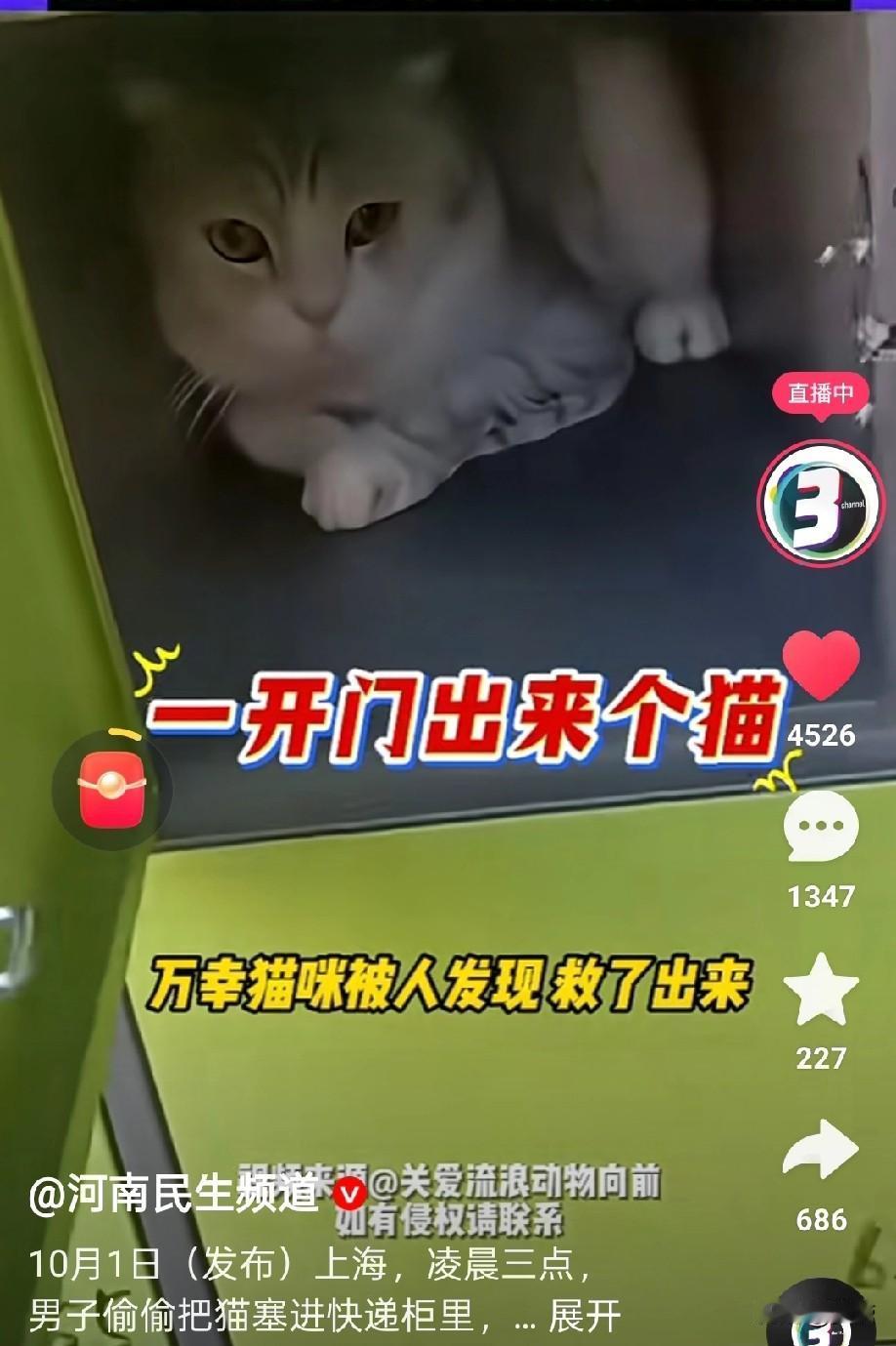太缺德了!凌晨三点,一男子抱着一只猫,发现快递柜门没关,鬼鬼祟祟的上前查看,刚开始还以为他是想看有没有遗漏的快递,没想到接下来的动作真是把人惊呆了!他直接把猫强行塞了进去,把柜门关上就离开了。万幸猫咪后来被人意外发现,平安无事! 真是缺了大德了!可以不爱但别伤害好吗?