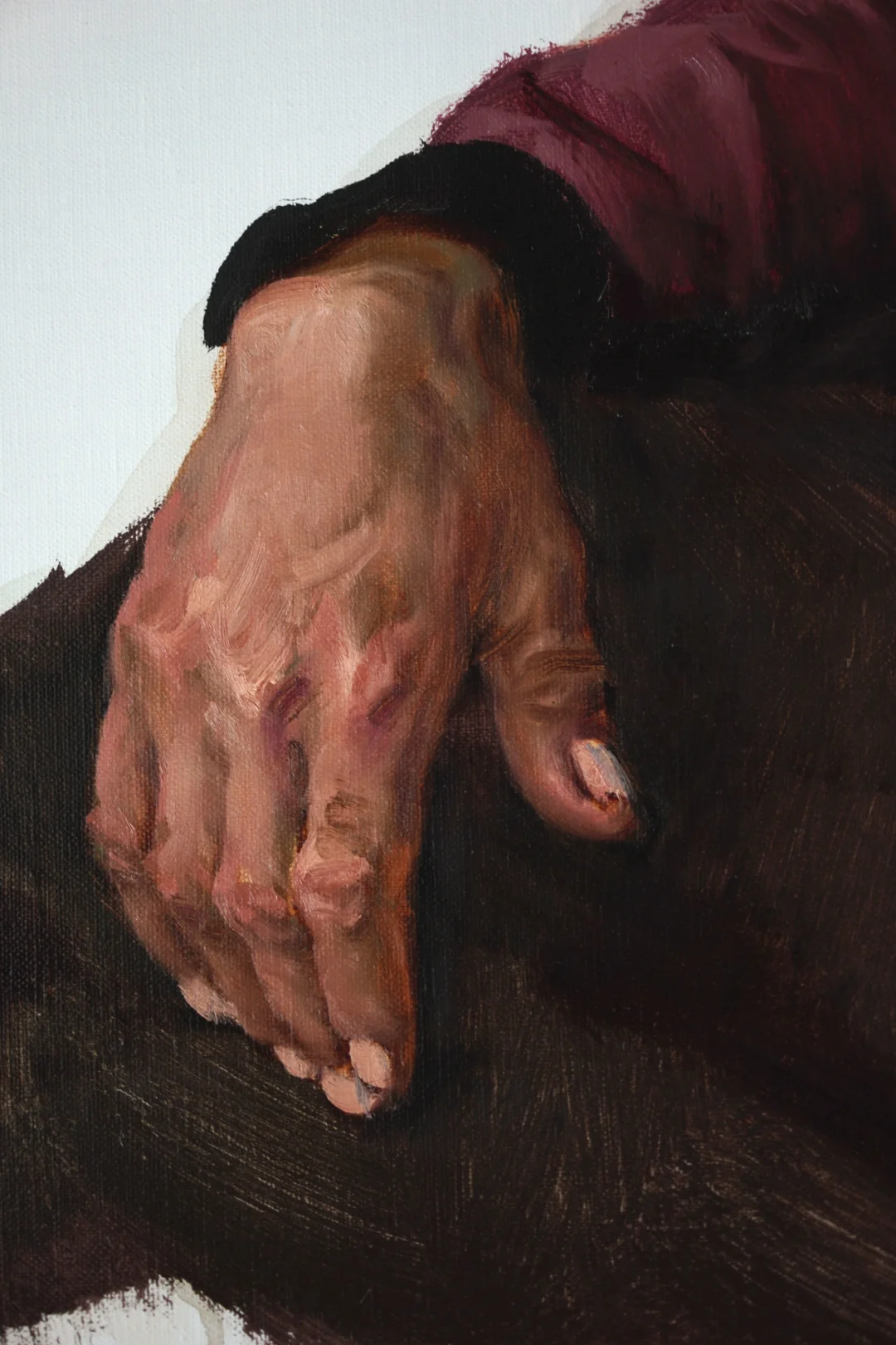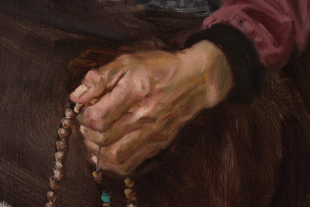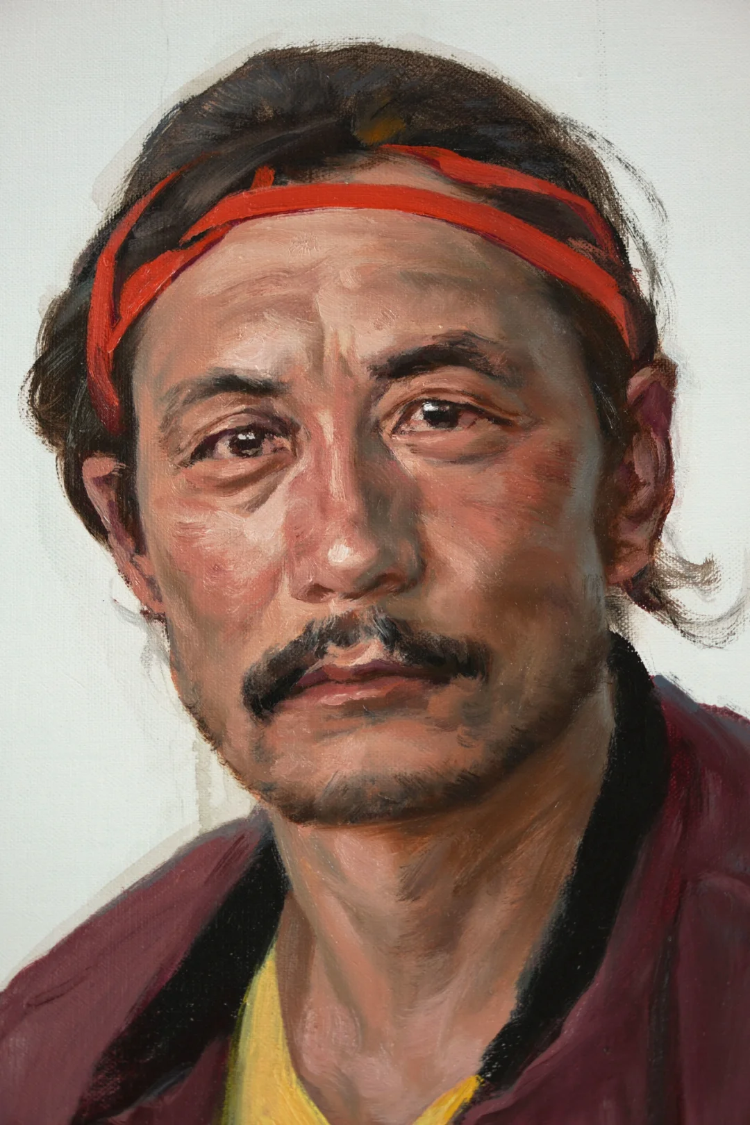 这幅画是去年夏天在青海泽库县的写生之一。被找来做模特的尼奥是一位四十岁出头的精壮汉子。他的名字是藏语“尼玛奥松”的简称,意思是“太阳的光辉”。尼奥是一位在家修行的宁玛派僧人,信仰虔诚,目光炯炯,谈吐幽默,留一嘴漂亮的小胡子,转动念珠的大手粗壮有力,干练的身板留下牧区劳动者的印记。宁玛派僧人的一头长发被红带子束于脑后,是额上一笔最传神的色彩。
