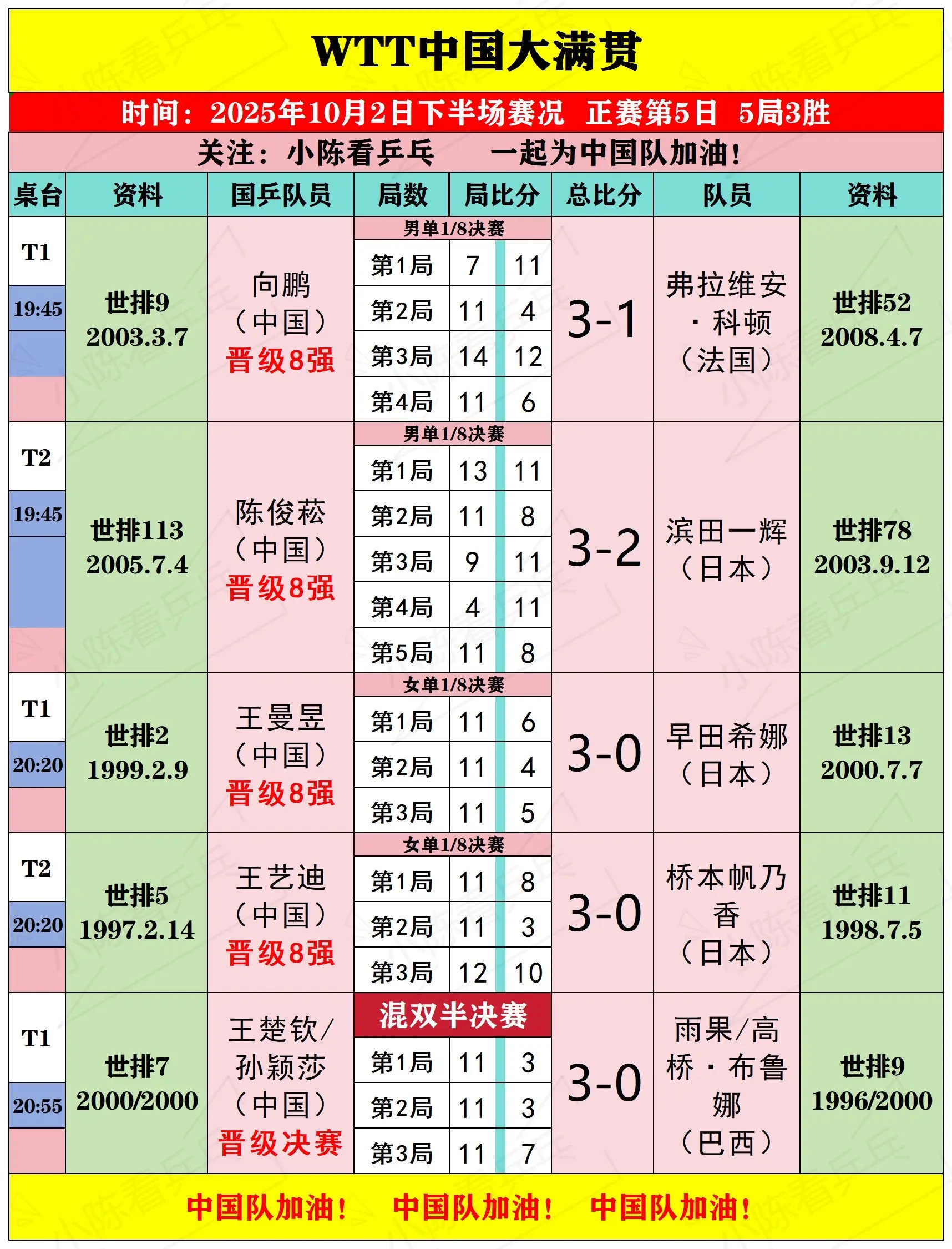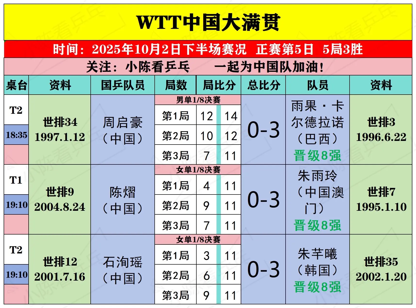 WTT中国大满贯10月2日下半场比赛结果。WTT中国大满贯10月2日下...