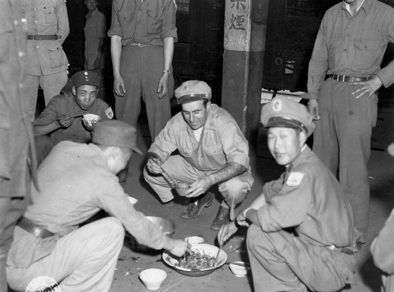 1946年的沈阳,一处简陋场所内,美军军官与国军军官围聚在地面的餐食旁,以蹲姿共食。面前的餐食十分朴素,大碗盛着简单的饭菜,旁侧散放着几只白瓷小碗,餐具也尽显粗朴。因条件所限,众人无桌凳可依,便直接蹲踞于地,神情间带着战地生活的随性。