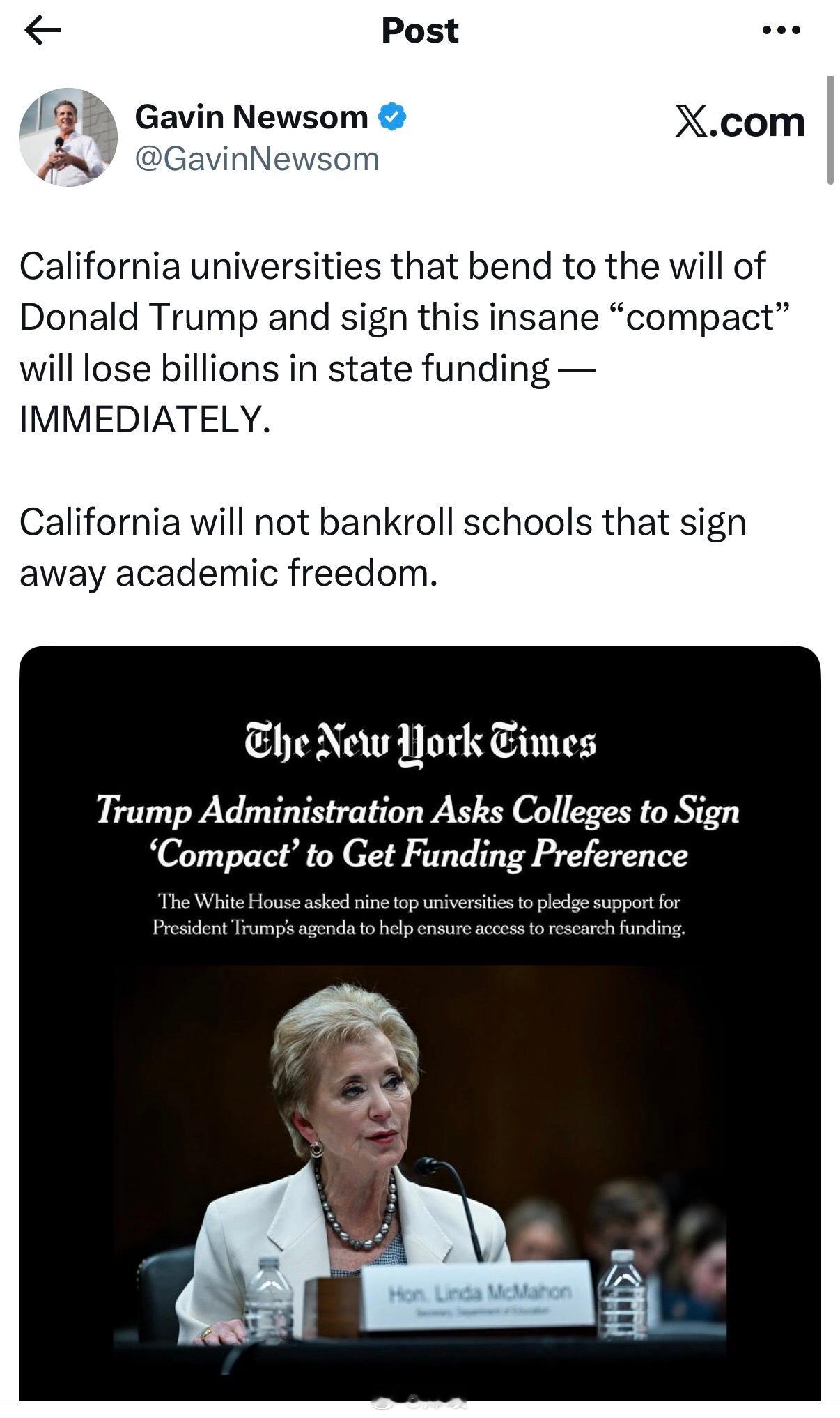 纽森:如果哪个加州大学屈服于特朗普并签署这份疯狂的“契约”,将立即失去数十亿美元的州政府资助。加州不会为那些出卖学术自由的学校提供资金。
