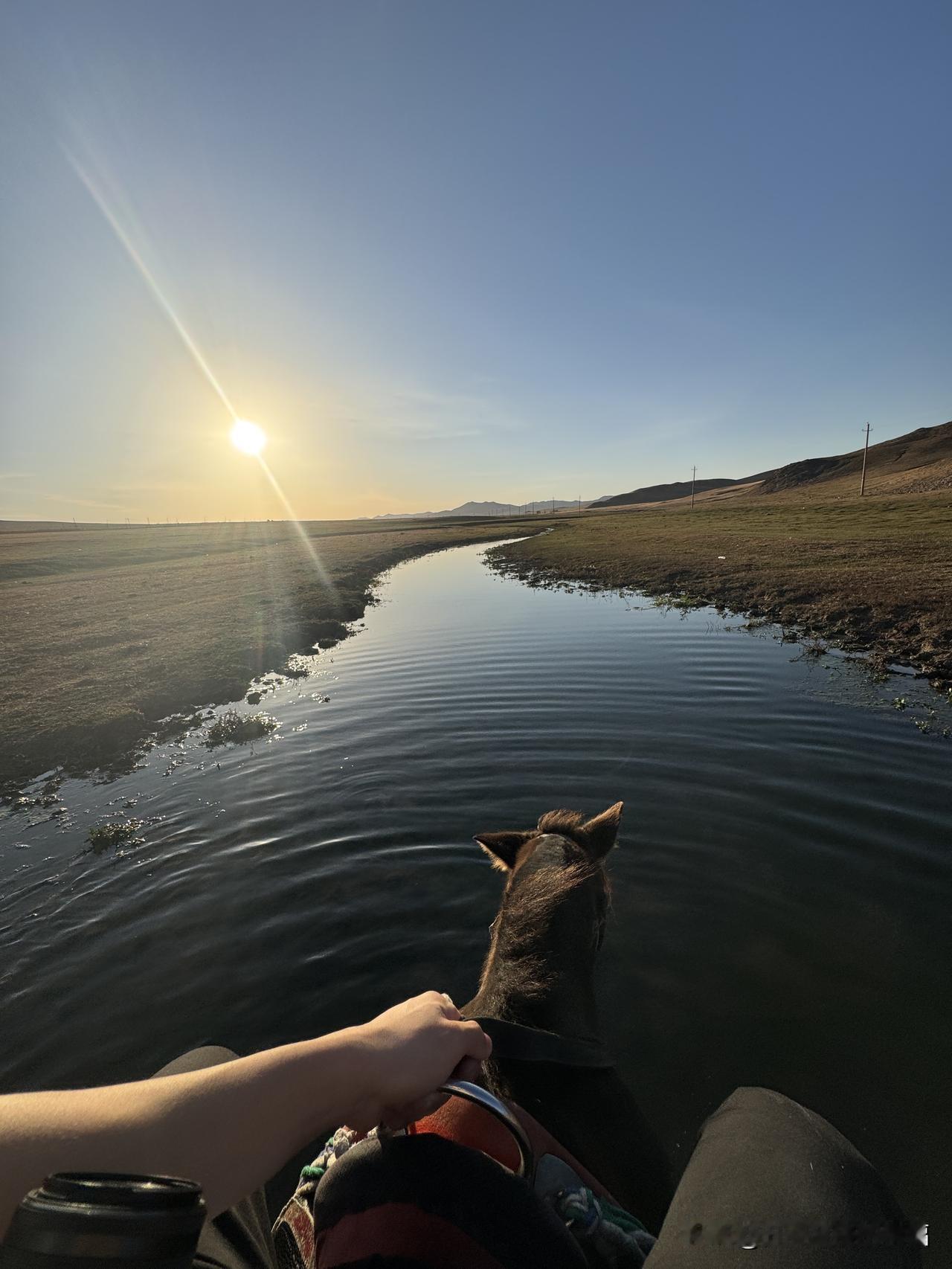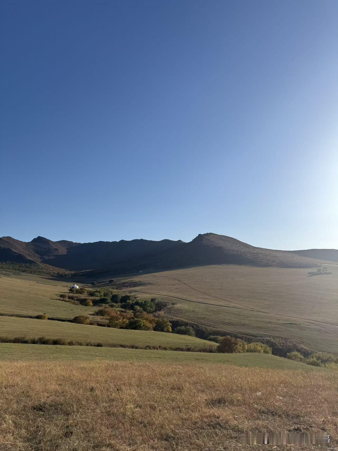 追随俞老师的脚步,是我一直以来的梦想。 这个国庆假期,老公决定满足我的心愿。自驾千里走进科尔沁[比心][比心] 我们选择留步扎鲁特旗军马场山地草原,虽然这里不是我梦想中草绿水美,牛羊成群的辽阔的大草原,但是初秋的草原却有着别样的美。秋日扎鲁特,草色含金,牧歌悠扬。扎鲁特的秋,是辽阔里的绚烂。更重要的是这里俞老师曾参加了传统的烤全羊的仪式,留下了助力乡村振兴的足迹。 避开烈日与拥挤,骑在马背上,在牧民的牵引下,从一开始的恐惧害怕到想到俞老师驾鹰策马的草原豪情,立刻有了勇敢和激情,在马背上我不仅感受到了草原的辽阔,高山的俊美,小溪的宁静,更有牧民和马儿的艰辛。在这片辽阔但贫瘠的土地上,看不到一棵庄稼,都是生命力顽强的野花野草,希望更多俞老师那样的大爱在这里播撒,让更多的生命在这里繁衍生息[比心][比心]