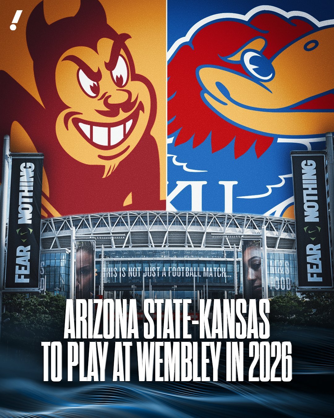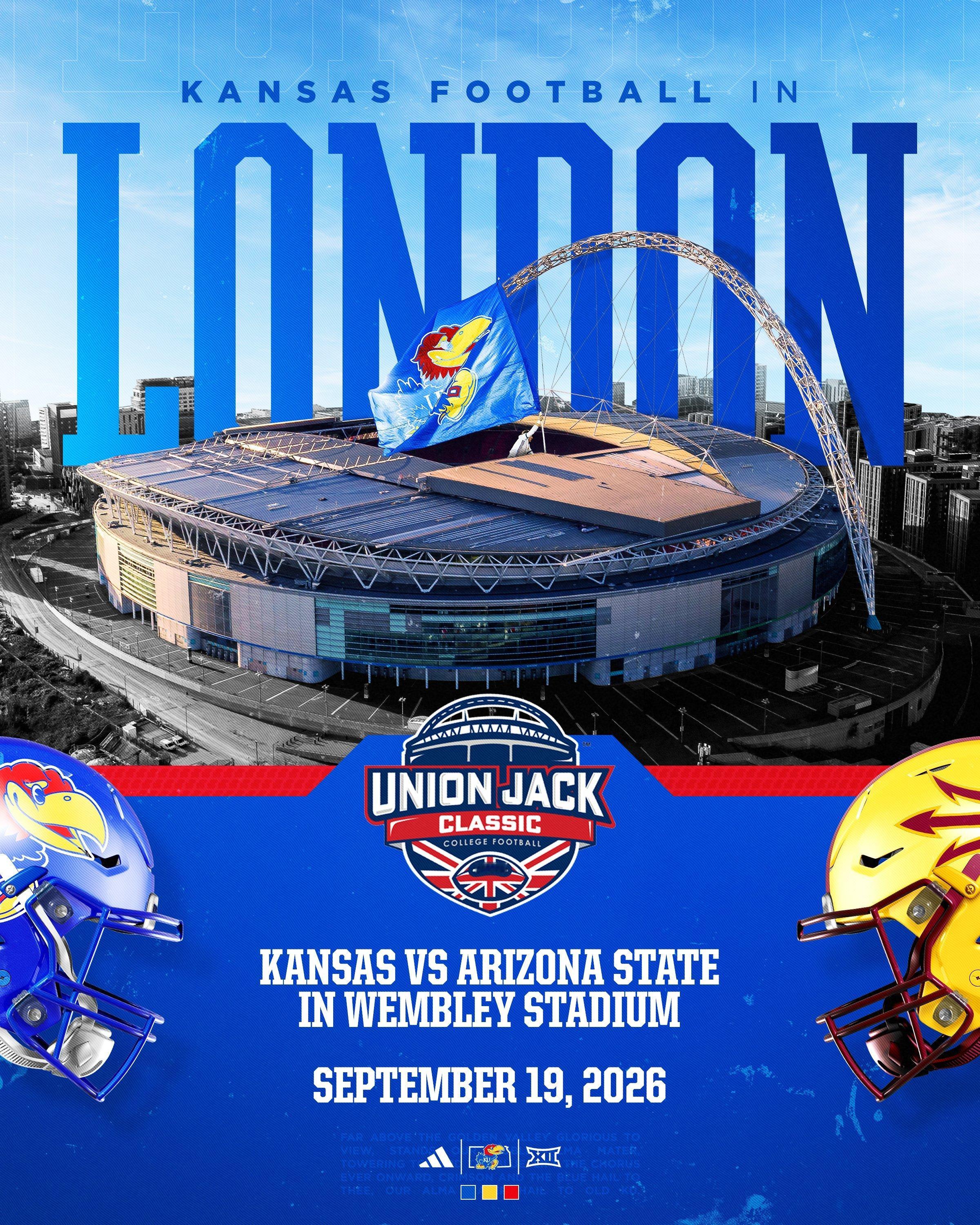 堪萨斯大学明年将在伦敦温布利球场,与亚利桑那州立大学举行Big 12常规赛揭幕战。这将是温布利首次举办大学橄榄球赛事,伦敦也成为NFL+NCAA双城。Big 12联盟今年其实在爱尔兰首都都柏林办过比赛,堪萨斯州立vs爱荷华州立。