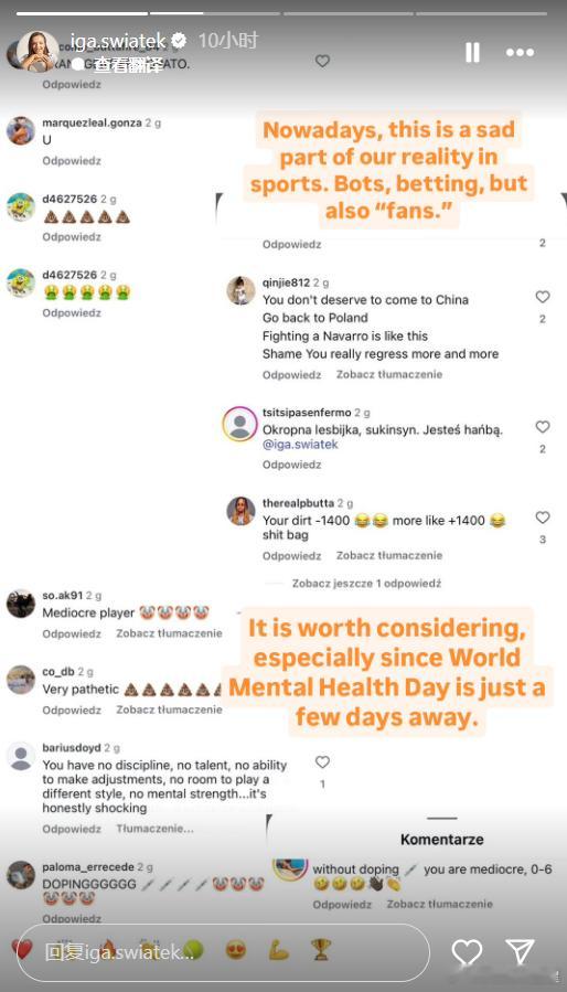 斯瓦泰克在中网吞蛋输球后遭到网暴:在当今体坛,这是令人难过的现实。机器人、赌博,