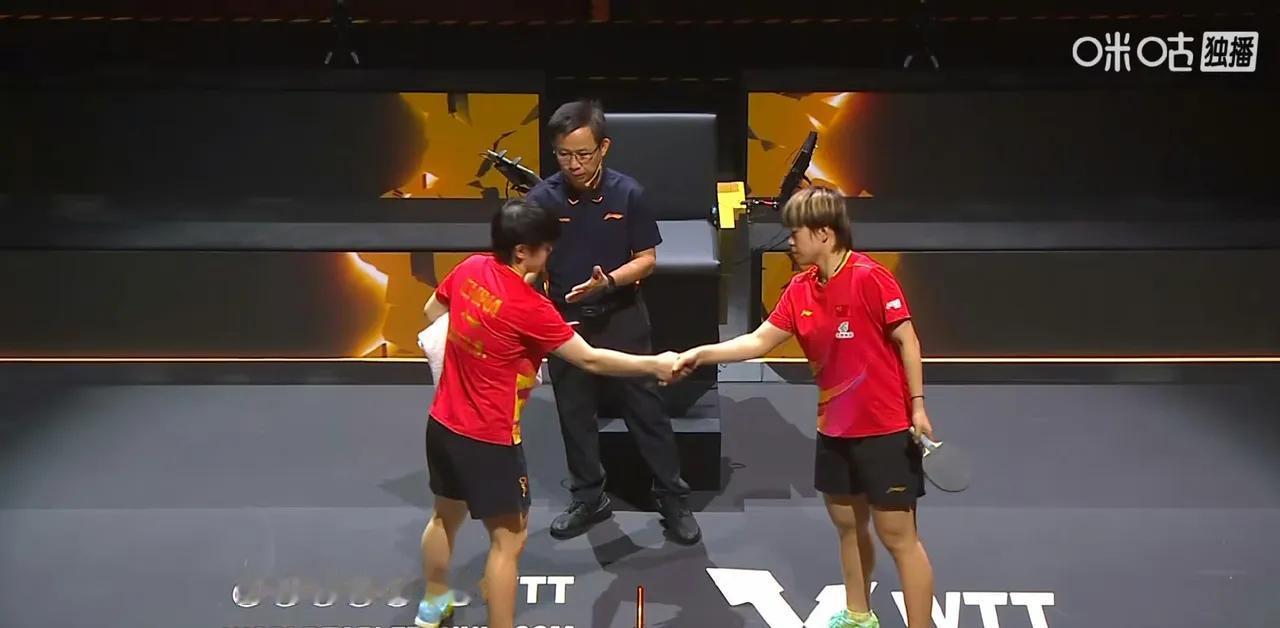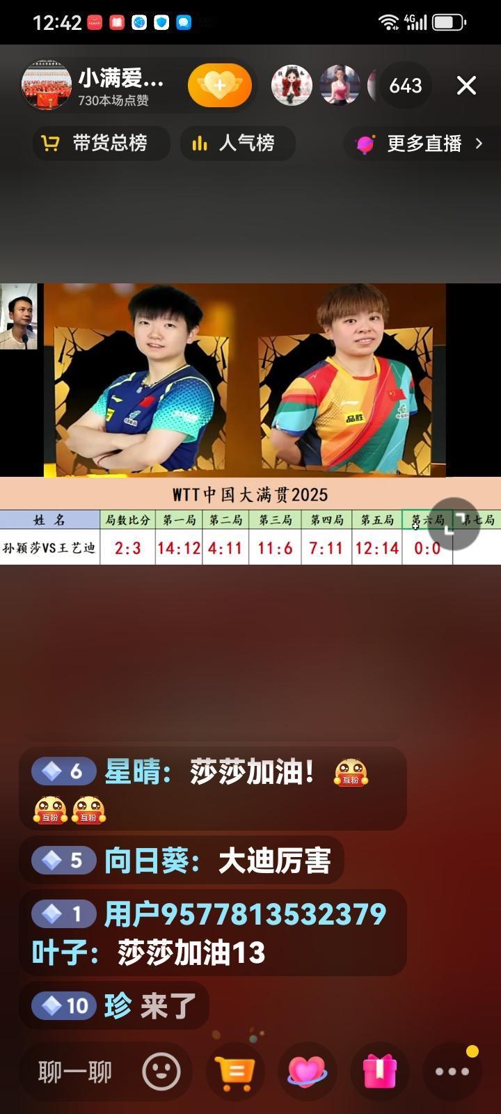 中国大满贯女单4强决赛 国乒内战王艺迪一孙颖莎的比赛正在进行中。莎莎状态一直不错