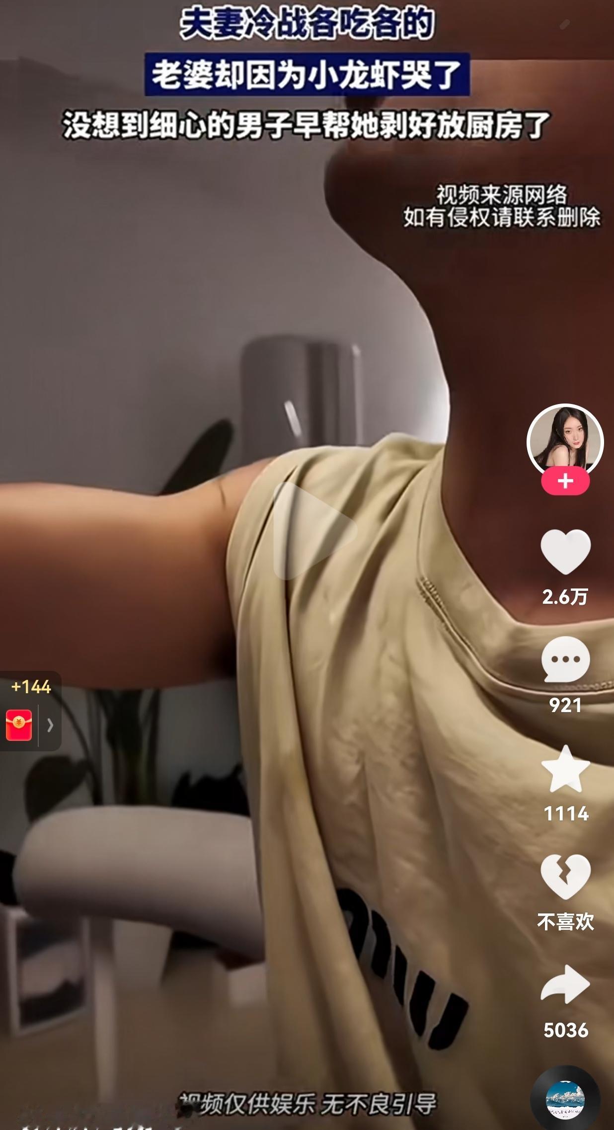 没有一顿龙虾解决不了的事情!男子跟老婆吵架了,吵架过后,随之而来的就是冷战,两个人都端着架子,谁看谁也不顺眼,谁也不愿意理谁。 谁知道丈夫的一个骚操作,瞬间让两个人的关系化解了! 因为,妻子不太会做饭,妻子呢又特别喜欢小龙虾,因此,男子就抓住妻子的这个特点,当着妻子的面做了一盘小龙虾。 一开始妻子还不在意,直接选择视而不见,男子看到妻子装作满不在乎,顿时就想出来了新的招数。 只见男子一边吃小龙虾,一边故意音高拔调,让妻子故意听见他的声音。 妻子听到后,越想越委屈,实在忍受不了了,直接走到丈夫的面前,一把鼻涕,一把泪地控诉自己的丈夫。对丈夫说:“你怎么这么自私呢?一个人吃独食,我也没有说自己不吃呀!” 男子看到委屈的妻子,知道自己的奸计得逞了!就开始安慰妻子只见男子说:“停停停,你也别哭了,我都给你剥好了,在厨房呢?我现在给你端出来,好不好?” 听到这话,妻子从委屈瞬间变得开心了起来。 网友看到后评论说,她一定是一直都很幸福,有个很疼她的老公,随便你信不信。 还有的网友说,这要是没给留着,估计都哄不好了。 果然,撒娇女人最好命呀!这女人一看就是很受宠,知道一哭二闹三上吊对自己的男人很有用,才对自己的男人使出杀手锏,当然了,男人也很聪明,懂得用什么方式化解危机。 按照这种方式相处,夫妻之间怎么可能有隔夜仇呢?大家觉得呢?欢迎大家评论区讨论留言。