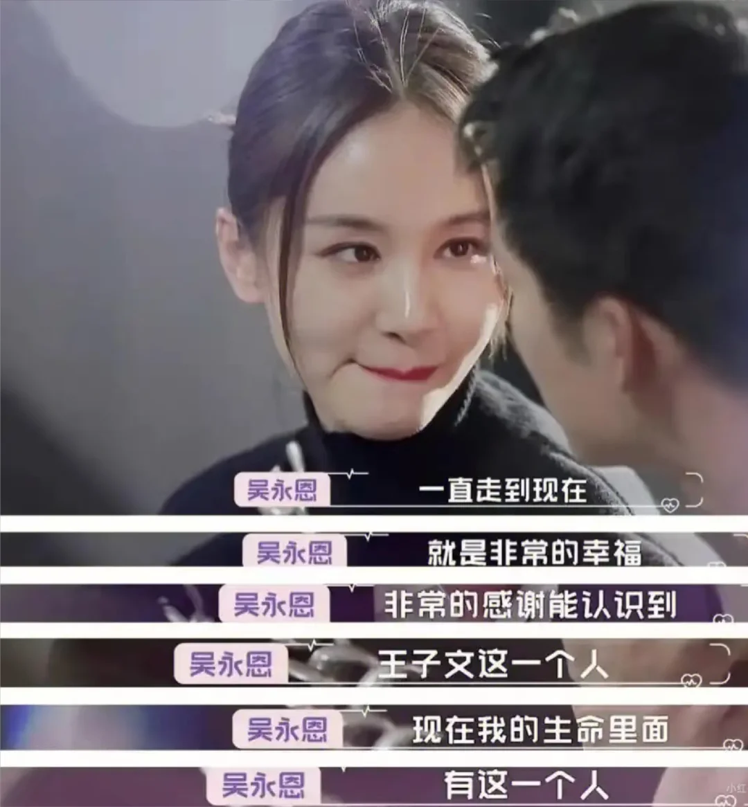 在节目里的时候,他们就拥抱亲吻了,王子文妥妥恋爱中女人的甜蜜,她还告诉了吴永恩她有儿子,吴永恩表示并不在意,两人继续相亲相爱还官宣了,偶尔也会秀秀恩爱,后来他们再次上节目的时候已经不对劲了。吴永恩完全不在意王子文,在镜头面前连演都不愿意演了[失望R]