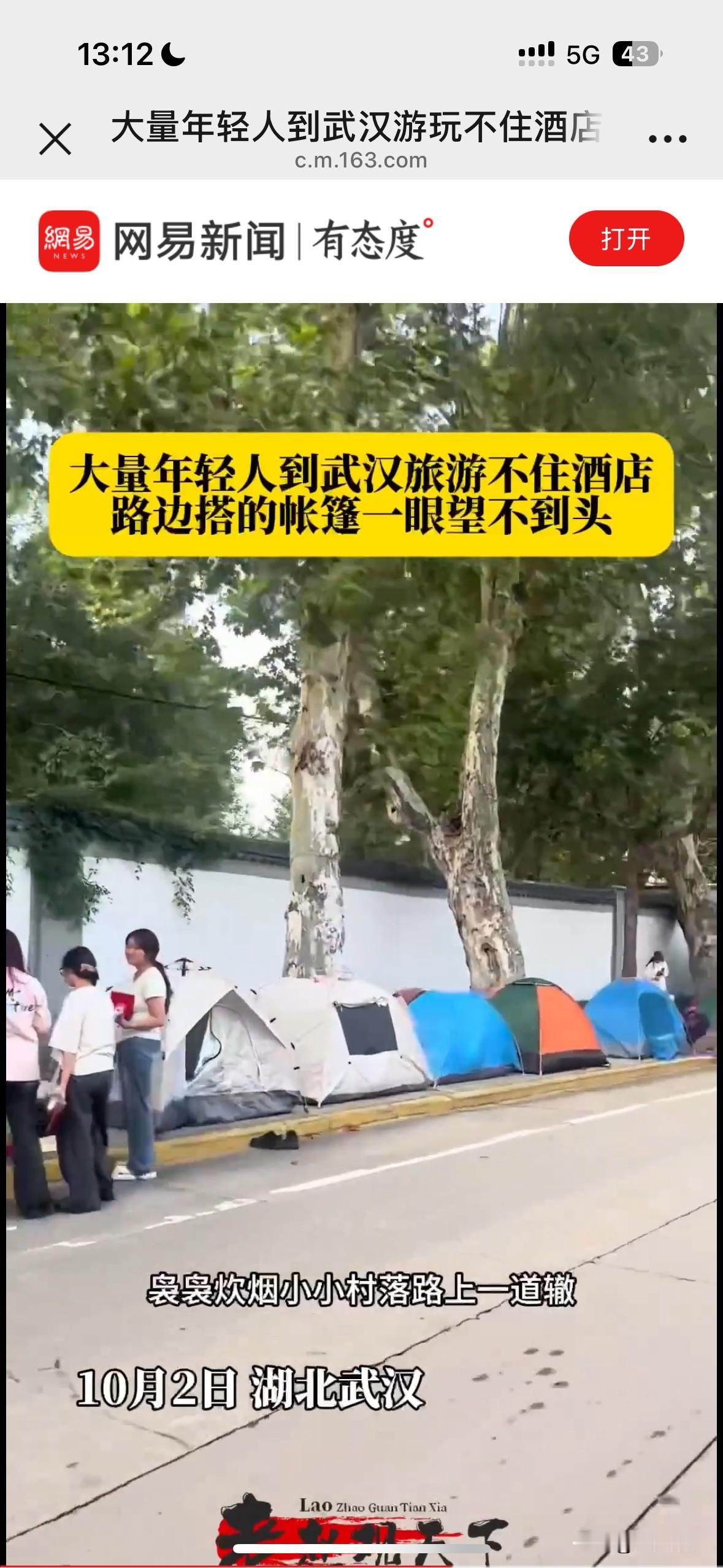 一开始我还以为这么多年轻人去武汉旅游,是不走寻常路,不订酒店是不想花那几百一晚的钱,自由自在带着帐篷就在路边过夜,看视频他们路边搭的帐篷一眼还望不到头; 结果仔细了解一番才知道,这是武汉音乐节活动。不是武汉接待不了这帮粉,而是他们有这种传统,追星到哪里都是如此,有组织的。这条路是汉阳汉江边的一条沿着龟山走向很冷清的马路,附近全部拆迁了并还未开建都是废弃的乱石堆,也不知道哪个机构在空地上塔了舞台搞的音乐节,招惹这么大一帮饭圈粉。白天看着还有人气,有市民晚上骑车过了一趟,路灯都没几根亮得,一一排排的帐篷堆在防水堤下,星星鬼火从帐篷里冒出微光,在黑暗的大街上如同异世界。 呵呵,潮人年轻人的世界,我们真的不懂。就看看,国庆哪里也没去,就当找个话题解解乏。