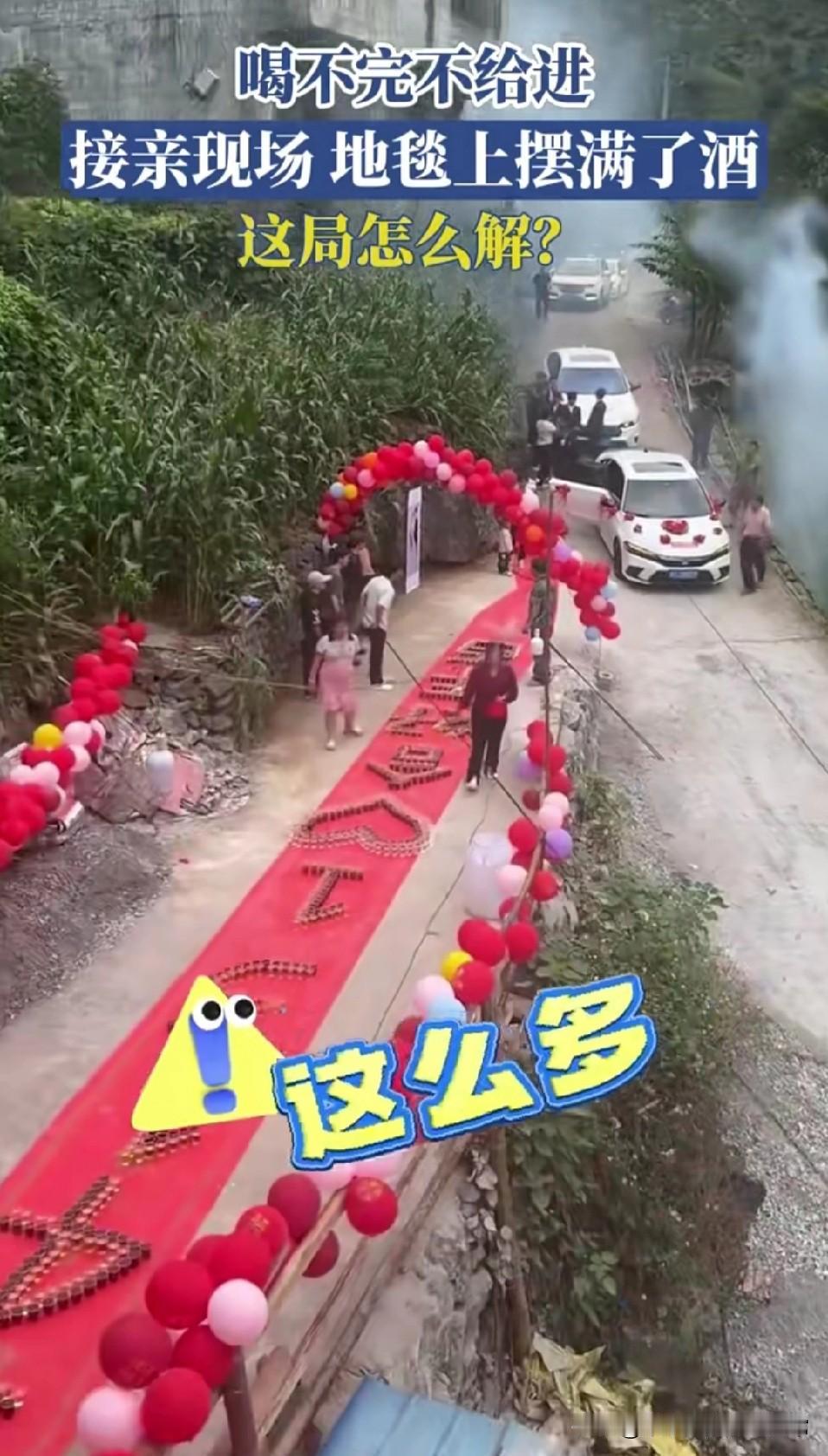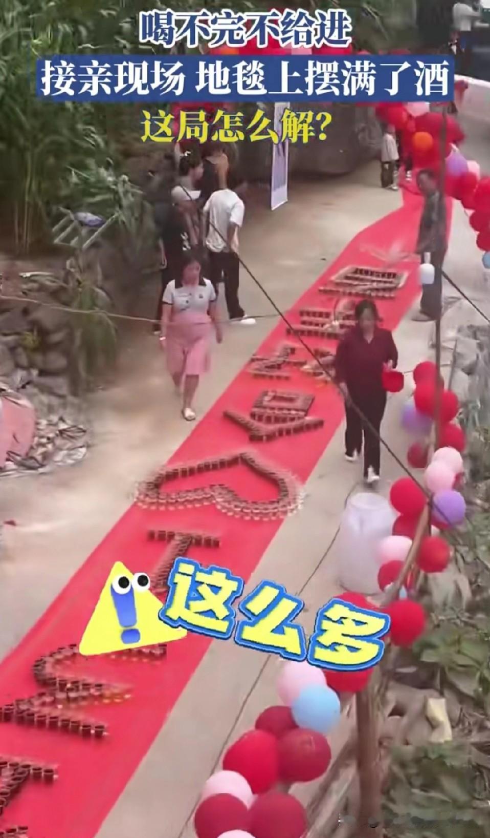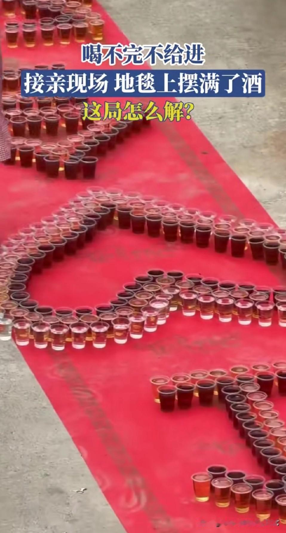 接亲喝不完不让进,新娘我不要了,掉头回家! 这离谱接亲!红地毯上摆满酒杯,跟摆了个酒阵迷宫似的,明晃晃写着“喝不完不给进”!这哪是接亲,简直是“拼酒大闯关”! 有网友调侃:“一杯一个红包,这不得掏几百个红包才能通关?” 更有人直言:“这新郎要是硬喝,怕是娶到新娘人也喝懵了!” 咱就说,结婚图个喜庆,整这么“硬核”的酒局,是热闹还是折腾? 要是你遇到这阵仗,是硬着头皮喝,还是干脆掉头走人?评论区唠唠,这种接亲习俗你觉得该留还是该改?
