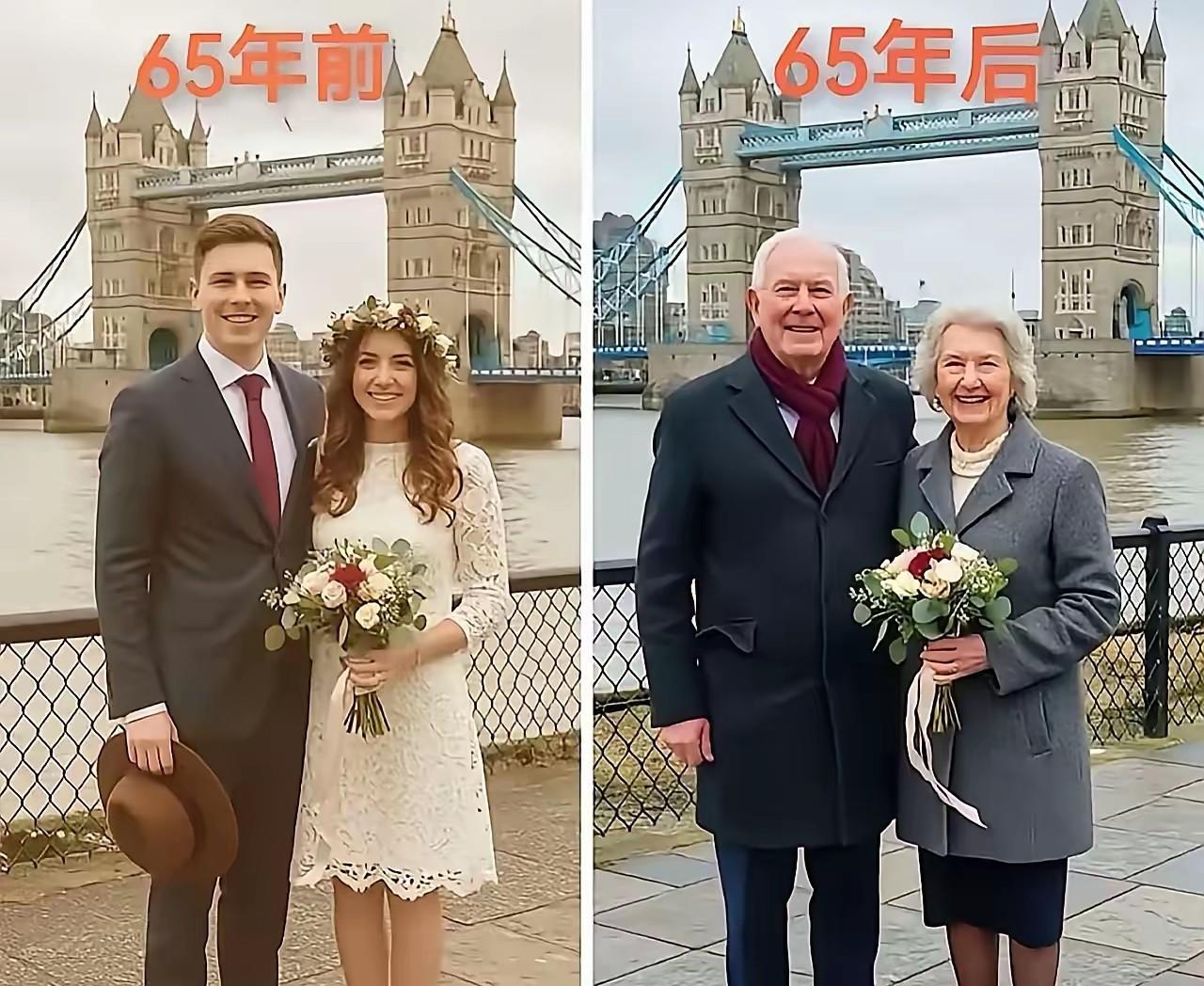 被岁月吹过的人 65年前少男少女 65年后老夫老妻 唯一不变的是两颗心和这个地点 几乎和65年前一模一样 岁月易老但景物不变爱情不变 这就有了睹物思人 人的一生会受到很多诱惑,但真正相爱的人不会因诱惑而改变的,这就是爱 65年后你们还会在同一个地方照相吗?欢迎在评论区里留言