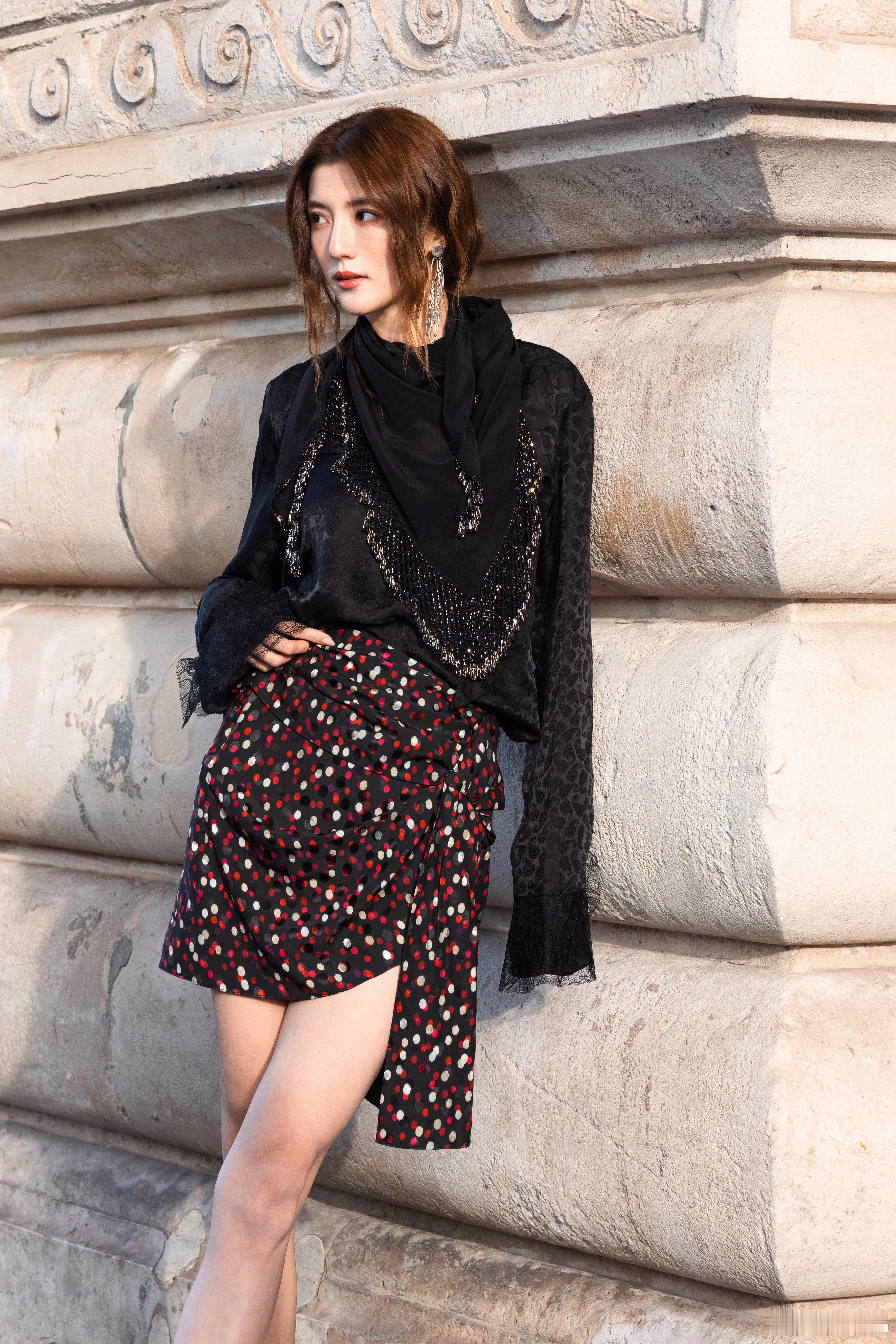 谁知道蔡文静和吴千语在说什么吴千语黑色鎏金长袖配波点裙,优雅不失俏皮超有个人风