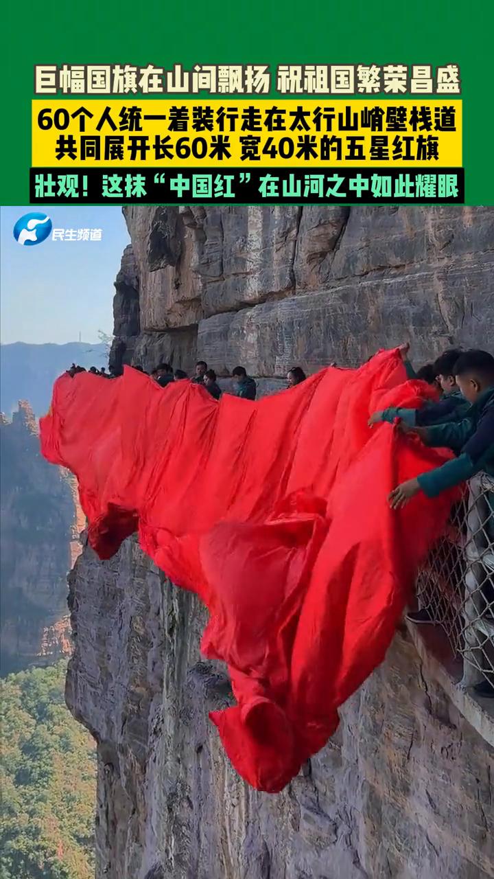 巨幅国旗在山间飘扬,祝祖国繁荣昌盛。 民生频道。 60个人统一着装行走在太行山峭壁栈道,共同展开长60米、宽40米的五星红旗。壮观!这抹"中国红"在山河之中如此耀眼。 9月28日河南新乡,60个人在太行山间展开巨幅国旗。三二一放,60个人仿佛"旗杆",紧紧地抓着国旗。山河之中的"中国红",祝祖国繁荣昌盛。