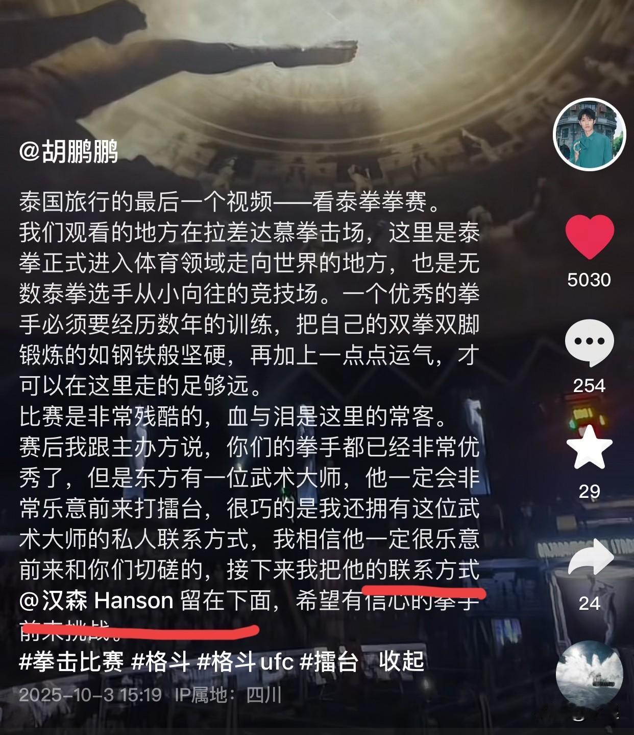 鹏鹏泰国旅游的最后一条报平安视频来了,看完他的文字忍不住笑出了声[偷笑] 鹏去看泰拳比赛,留下了汉森的联系方式,邀请泰国拳手来找汉森切磋,如此扬名立万的好机会,鹏鹏让给了自己的好兄弟[笑哭]不得不说,对自己兄弟可真好[大笑] 汉森表示,作为东方的武术大师,他第一次参赛就获得了冠军。。。 行,那你俩挺厉害,新组合——中国拳王和他的金牌经纪人,鹏鹏&汉森,闪耀泰兰德[耶] 明天与辉同行就要开播了 感觉明天早上直播间会有10万+的观众 毕竟大家守店已经成了习惯 就喜欢看这帮孩子在屏幕前活跃着[耶]