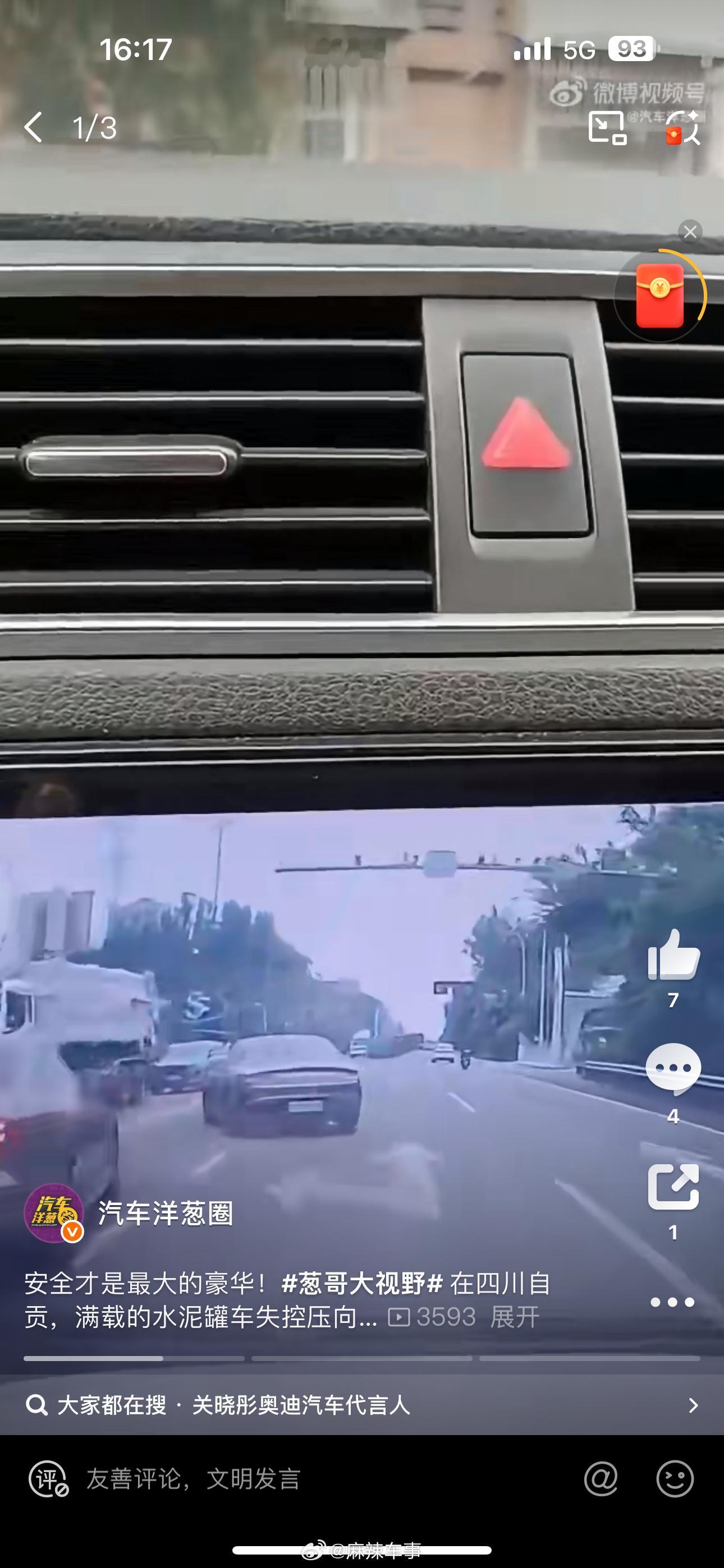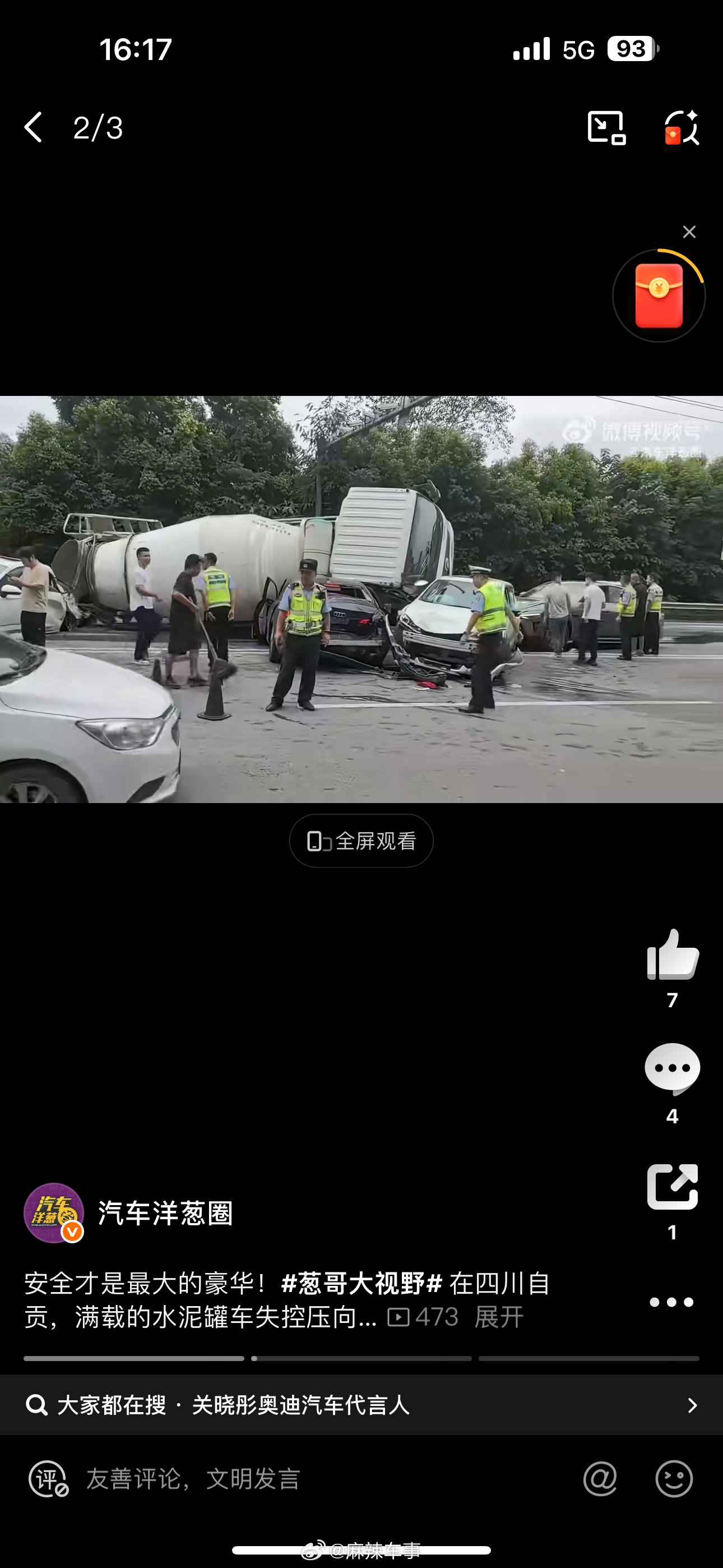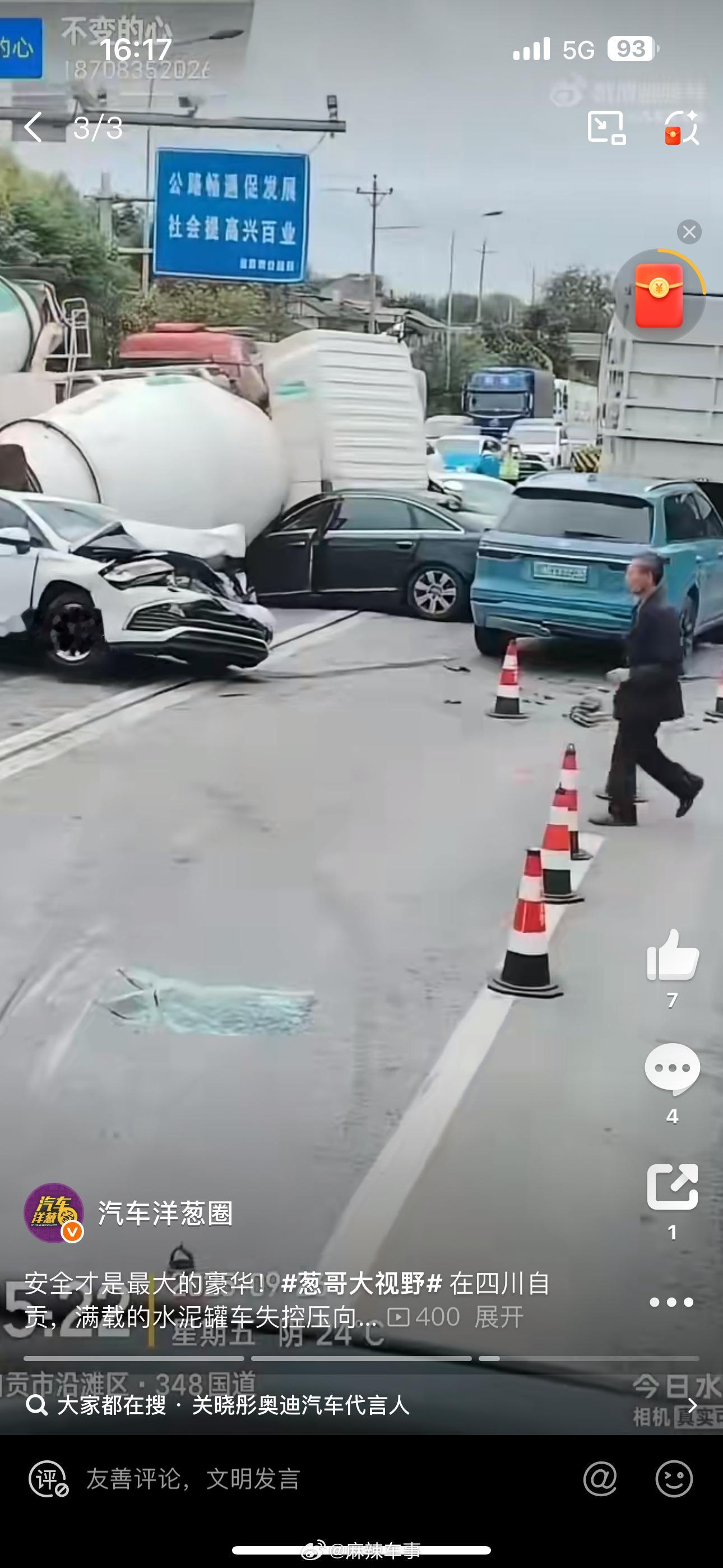 在四川自贡,满载的水泥罐车失控压向了一辆奥迪A6L