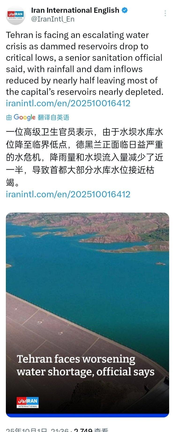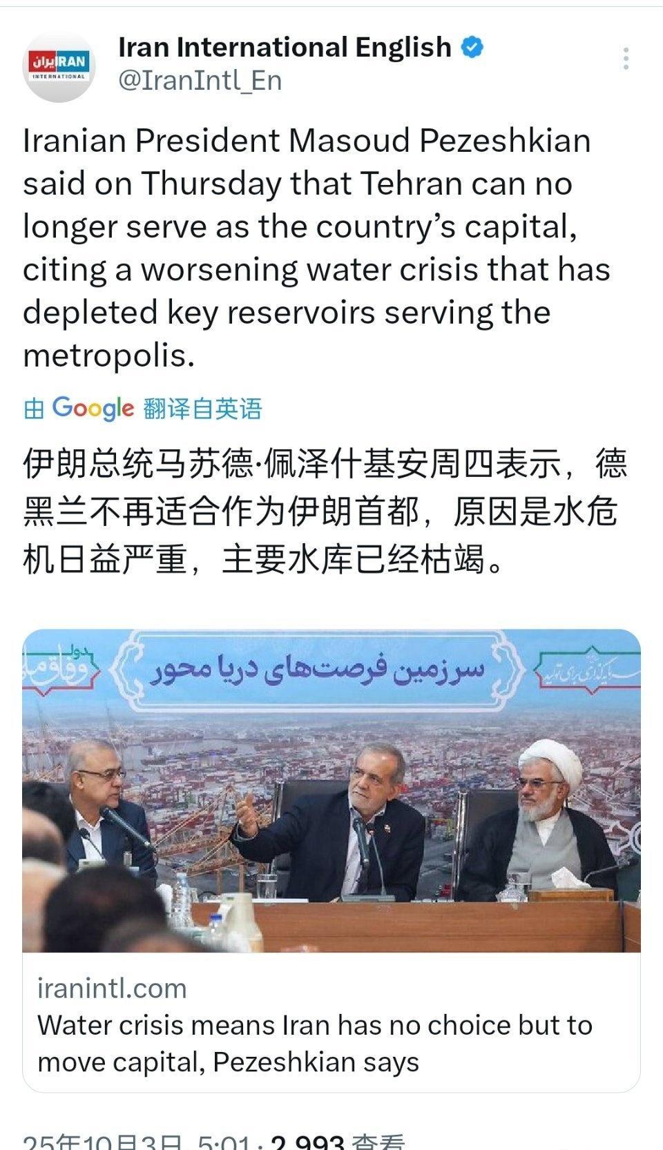 历史上也有不少国家因为水资源等各种原因迁都的。伊朗这是要准备迁都了? iranintl10月3日报道。伊朗总统马苏德·佩泽什基安周四表示,德黑兰不再适合作为伊朗首都,原因是水危机日益严重,主要水库已经枯竭。