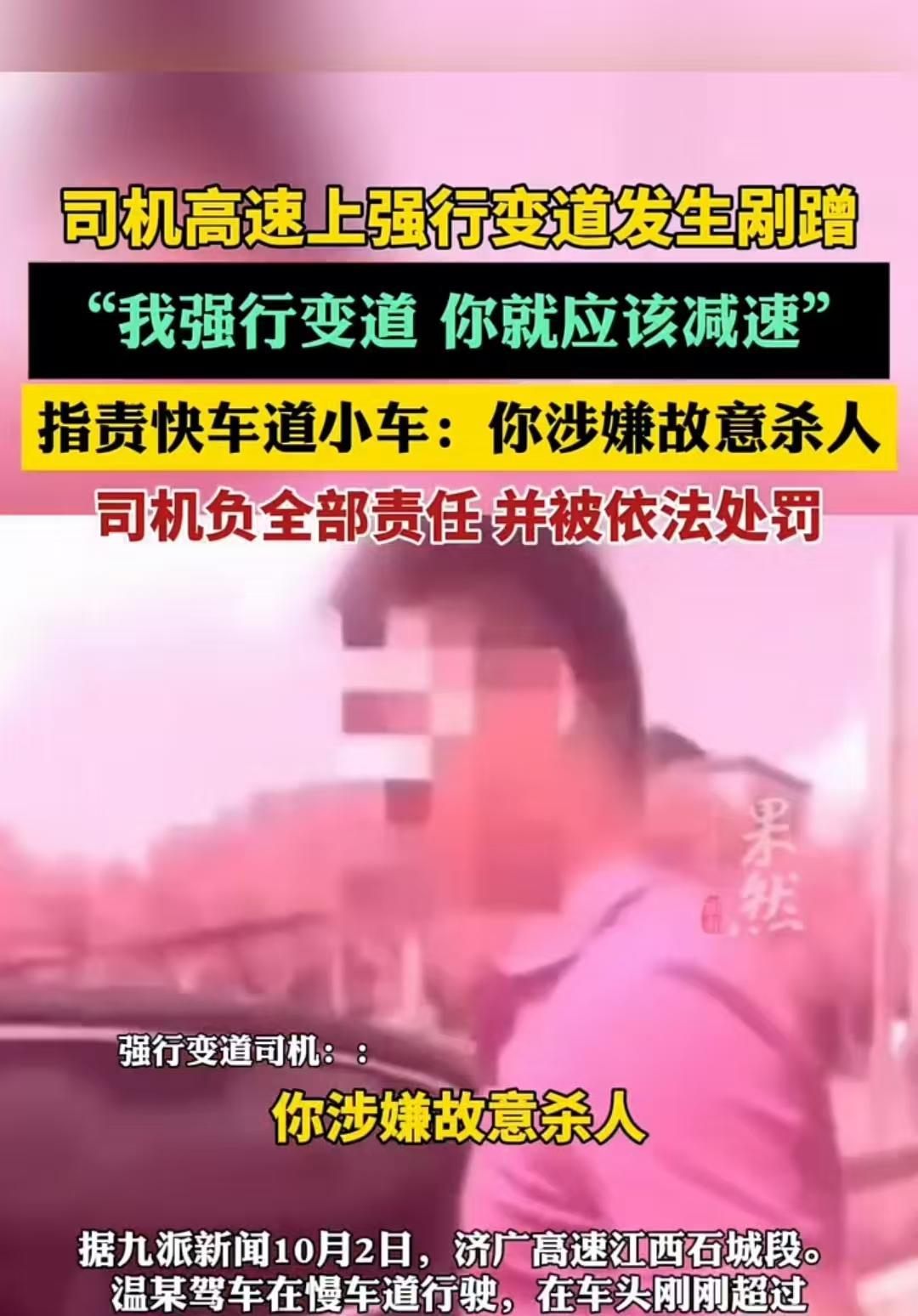 “你不让我变道,就是涉嫌杀人”。济广高速上,男子想从慢车道变到快车道,刚刚超过别人车头一点点,他就强行变过去。对方来不及减速,直接撞了上去。他反倒指责对方:你怎么不减速?你这是涉嫌“杀人”。对方和他辩论了一会儿,也懒得理睬他,直接等待民警处理。随后,男子不但被批评教育了一个小时,还受到相应的处罚。网友们看到后都大快人心。 国庆期间,温某也想出去凑凑热闹,于是开着自己的车行驶在慢车道上。 他为什么在高速路上行驶在慢车道,没人知道,反正他最开始就没打算开太快。可突然他改了主意,想加快速度,便想变到快车道去。 此时,有一辆车在快车道上快速驶过,温某也卯足劲在慢车道上追了上去。等车头刚刚超过那辆车的车头时,温某就开始变道。 他想变道到小车行驶的快车道,按道理说变道得保证两侧有一定距离,可他不知怎么想的,直接就想在小车前方一点点变过去。 小车车主也慌了,来不及减速,两车直接碰到了一起。幸好只是轻微刮擦,没有造成人员伤亡。 小车车主还没来得及生气,温某就气势汹汹地指着他:你干嘛?没看见我要变道吗?你怎么开这么快? 小车车主很无语:怎么遇到这么不讲道理的人?你就在我前面一点点变道,知道这有多危险吗?这可是高速路,车速都在100码以上,你让我怎么急刹车? 两人就这样你一言我一语地争执起来,好在没有发生肢体冲突,只是口角之争。 不一会儿,民警赶到现场查看情况,听完两人的讲述后,直接批评温某:你这是强行变道,属于违法行为,知道吗?幸好没出重大事故,要不然你这种行为够判刑了。 温某还是不服:我变道,他就应该让我,他在后面不让就算了,还有加速的迹象,就是不想让我变道。 要是出了事,就是他不避让的责任,如果他稍稍放慢速度,我就能变道成功了。 民警实在听不下去了:变道不需要保持车距吗?谁让你就在人家前面一点点变道的? 要是人家也从快车道变到慢车道,用同样的距离,你来得及避开吗?来得及把车速降下来吗? 温某依旧觉得不是自己的错,认定是对方有意为难自己,还斥责对方就是想故意害他,这属于涉嫌“杀人”。 民警明确告诉他:这次事故是你全责,不是对方害你,是你险些伤害到别人,你是真不知道,还是故意不想知道? 就这样,民警对温某劝说教育了一个小时,他终于认识到自己的错误,不再嘴硬,赶紧给小车车主赔礼道歉,希望能获得谅解。 最后,温某被判全责,不仅要受到交通部门的处罚,还得赔偿小车车主的损失。 网友们看到后,纷纷表示这样的人不能惯着:但凡有点常识的人都知道这种做法是错的,他怎么会不知道?不但要罚,还应该重罚,让他以后再也不敢强行变道。 1、温某高速上“车头刚超就硬变道”,违了啥交规? 《道路交通安全法实施条例》第四十四条第二款:变道不能影响其他车道车子正常开。 《记分管理办法》:高速违法变道,一次记3分。 《道路交通安全法》第九十条:违了通行规定,能警告,也能罚20到200块。 温某车头刚超过人,就硬往过变,没留安全距离,直接挡了人正常开。这明显碰了变道不能影响别人的规矩,高速上犯这错,记3分、罚点钱跑不了。 2、这刮蹭事故,责任咋定?法律咋说的? 《道路交通安全法实施条例》第九十一条:交警看当事人行为对事故的作用、过错大小,定责任。 事故就是温某硬变道搞出来的,他是直接原因,快车道车主没做错啥。按条例来,温某肯定得负全责,没二话。 3、温某要承担啥法律后果? 《道路交通安全法》第九十条:可警告,或罚20-200元。 《记分管理办法》:高速变道违规,记3分。 《民法典》第一千一百六十五条:自己过错搞坏别人东西,得担侵权责任。 首先得受处罚,记3分再罚点钱;然后小车修啥的,他得全额赔,毕竟是他的错;幸好没撞伤人,不然可能还得蹲局子,民警也说了这事儿。 对于此事,大家如何看? 信源:九派新闻2025-10-2