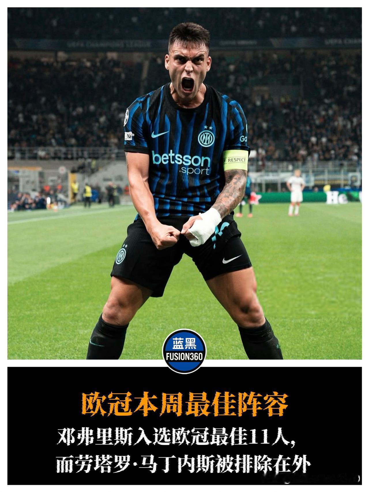离谱!劳塔罗梅开二度却无缘欧冠周最佳,邓弗里斯入选 欧足联公布本轮欧冠最佳阵容
