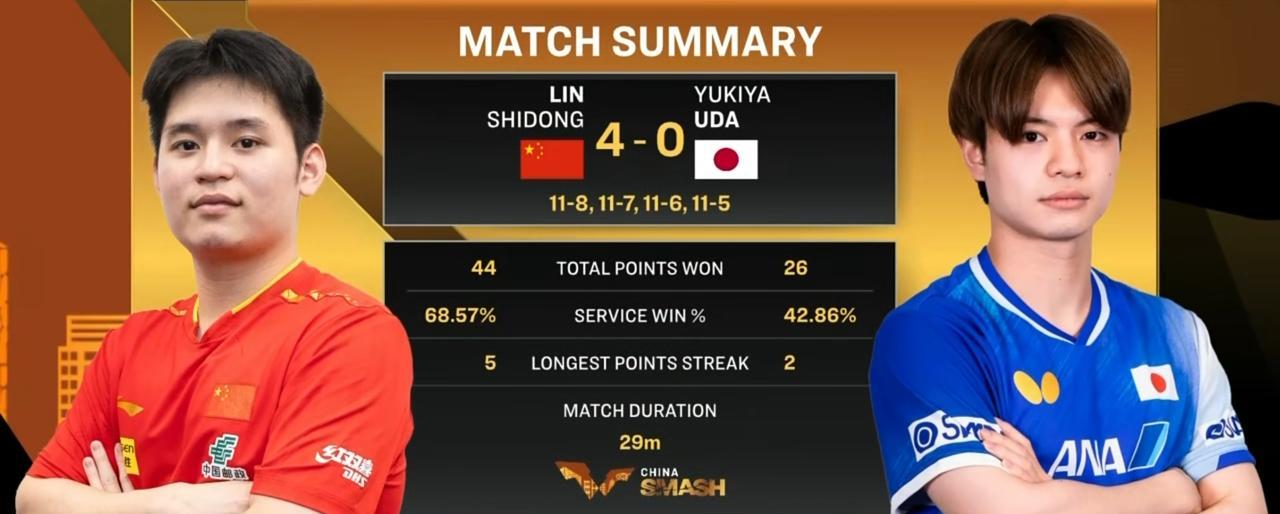 林诗栋横扫宇田幸矢,孙颖莎力克王艺迪,国乒男双包揽冠亚军,WTT中国大满贯丨国乒队员午间场次比赛战报: WTT中国大满贯丨午间场次北京时间11:00开打,男单1/4决赛林诗栋横扫宇田幸矢晋级四强,本场比赛林诗栋展示了强大实力,反手快速精准打击又回来了! 男双半决赛周启豪/陈俊菘力克户上隼辅/松岛辉空晋级决赛,由另外一场半决赛在国乒队员之间展开,所以国乒男双已包揽本站比赛冠亚军! 女单1/4决赛孙颖莎大战七局力克队友王艺迪晋级四强! 女双半决赛第一场比赛王曼昱/蒯曼实力优势明显直落三局横扫队友陈幸同/钱天一晋级决赛! 赛果如下: (1)男单1/4决赛 (3)女单1/4决赛 (4)女双半决赛 (5)女双半决赛