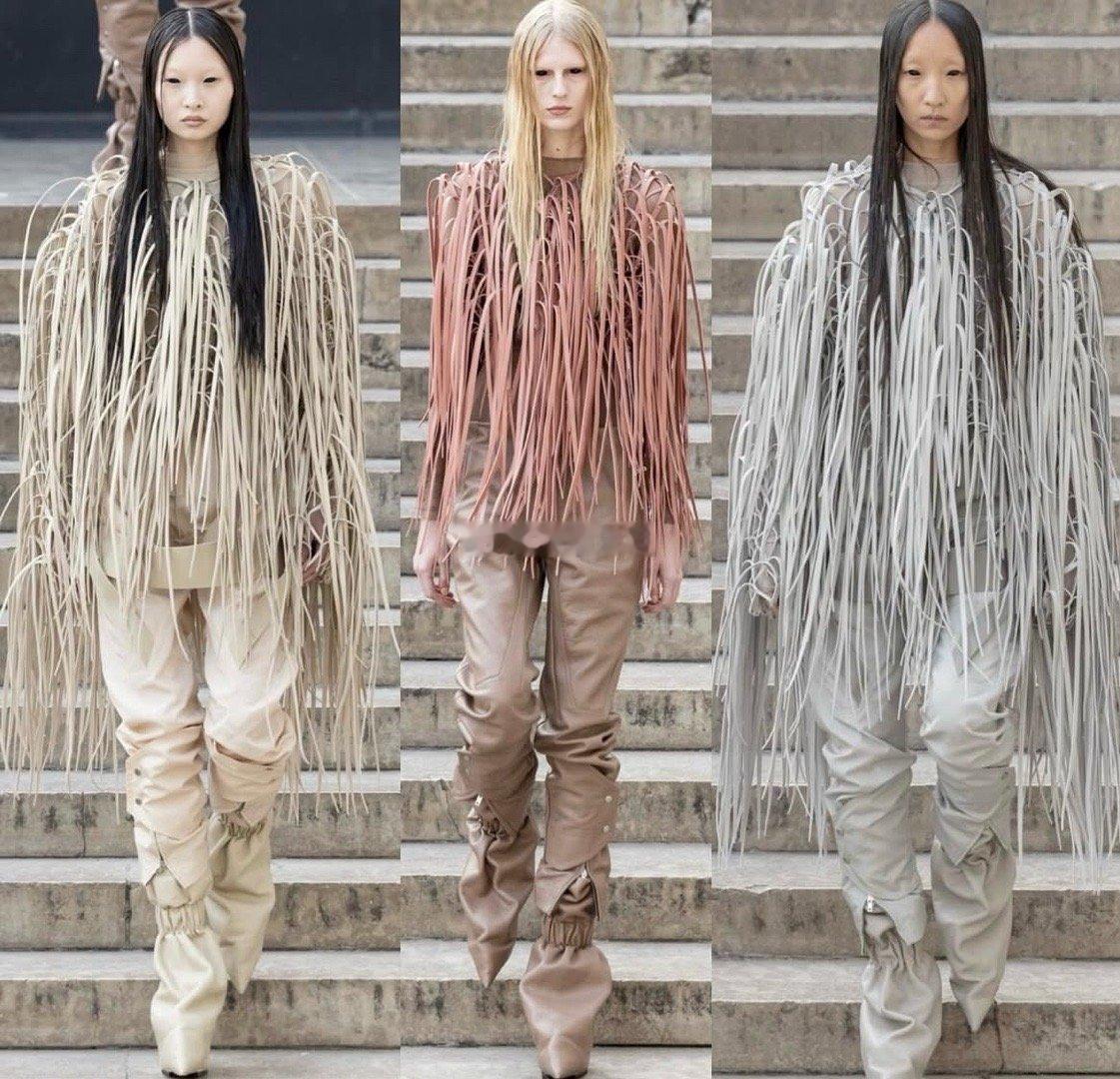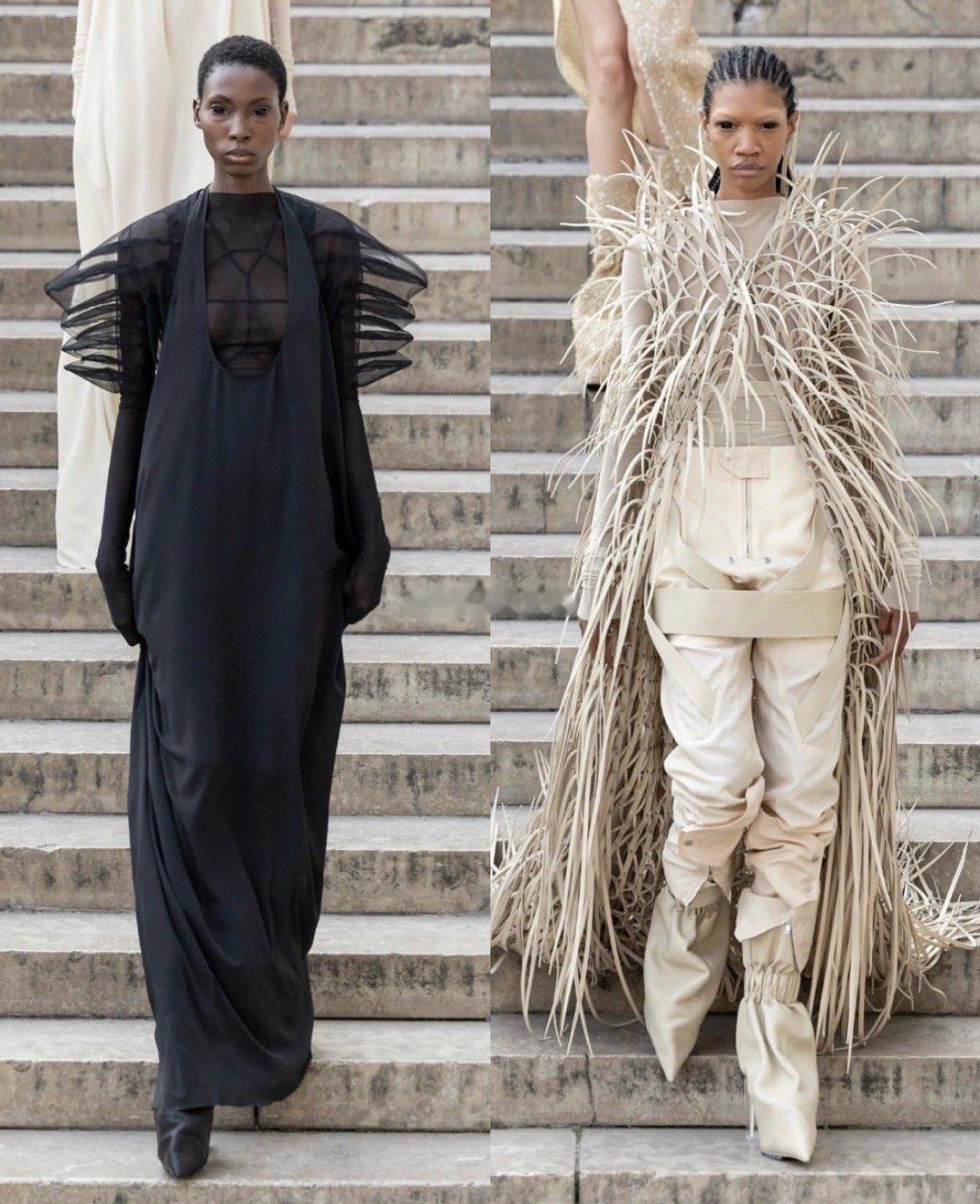 本季,标志性的建筑感廓形被再次推向极致。夸张的肩部设计、流畅的拖地长线条、以及坚挺的皮革与薄如蝉翼的纱质面料形成强烈对比。色彩依旧是熟悉的Owens调色盘:骨白、沥青黑、大地灰,纯粹而富有力量。