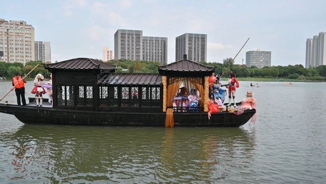 随着船只行进,演员们或转身、或挥剑、或翩翩起舞,湖风轻拂而过,水波、音乐与舞蹈交织融合,国潮气息扑面而来。“演员们的服装太漂亮了,整体氛围超级棒,像在看一场精心编排的舞台剧。”市民李妍菲说。