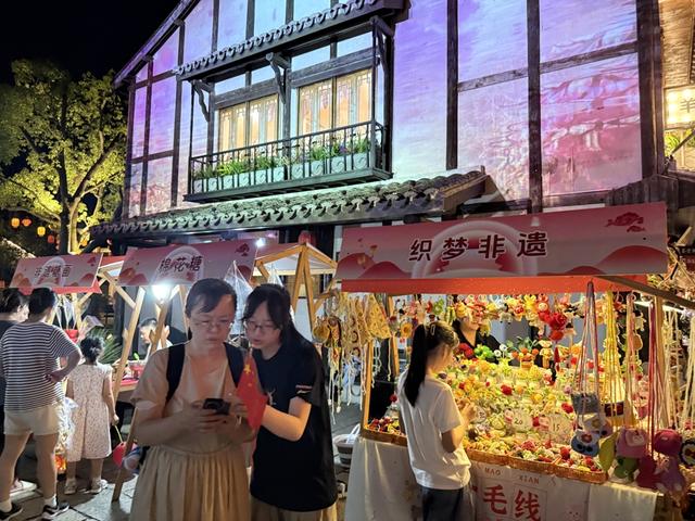 记者发现,为了提供全方位国潮体验,朱家角古镇景区还以茂盛的树冠为幕布,将古风灯光秀打在树冠上,营造出独特的光影效果。沉浸式文化季期间,售卖各类非遗产品的“角里货郎”还会推着车穿梭于老街,吆喝声穿街过巷,市井烟火与古镇风貌相映成趣。