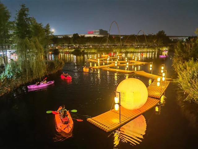 蟠龙新天地在蟠龙古镇基础上打造,既保留了元代香花桥、清代程家祠堂等,又注入了现代商业与文化活力。9月底开始,蟠龙新天地推出为期12天的“新焺游园·月满蟠龙”中秋文化盛宴,包括“听曲、吃席、赶集、切磋、赏灯”等活动。记者看到,老街水系中不时有淡黄色的荧光皮划艇慢悠悠划过,引来岸上游客纷纷拍照。