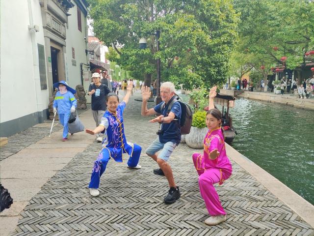 伴随着阵阵喝彩,扎着马步刚打出一拳的英国游客安德森兴奋得满脸通红,又做了个类似“白鹤亮翅”的动作。国庆长假里,朱家角古镇西井街上,刚看完《舷歌武韵》船拳表演的安德森意犹未尽,在岸边比画起了武术招式。