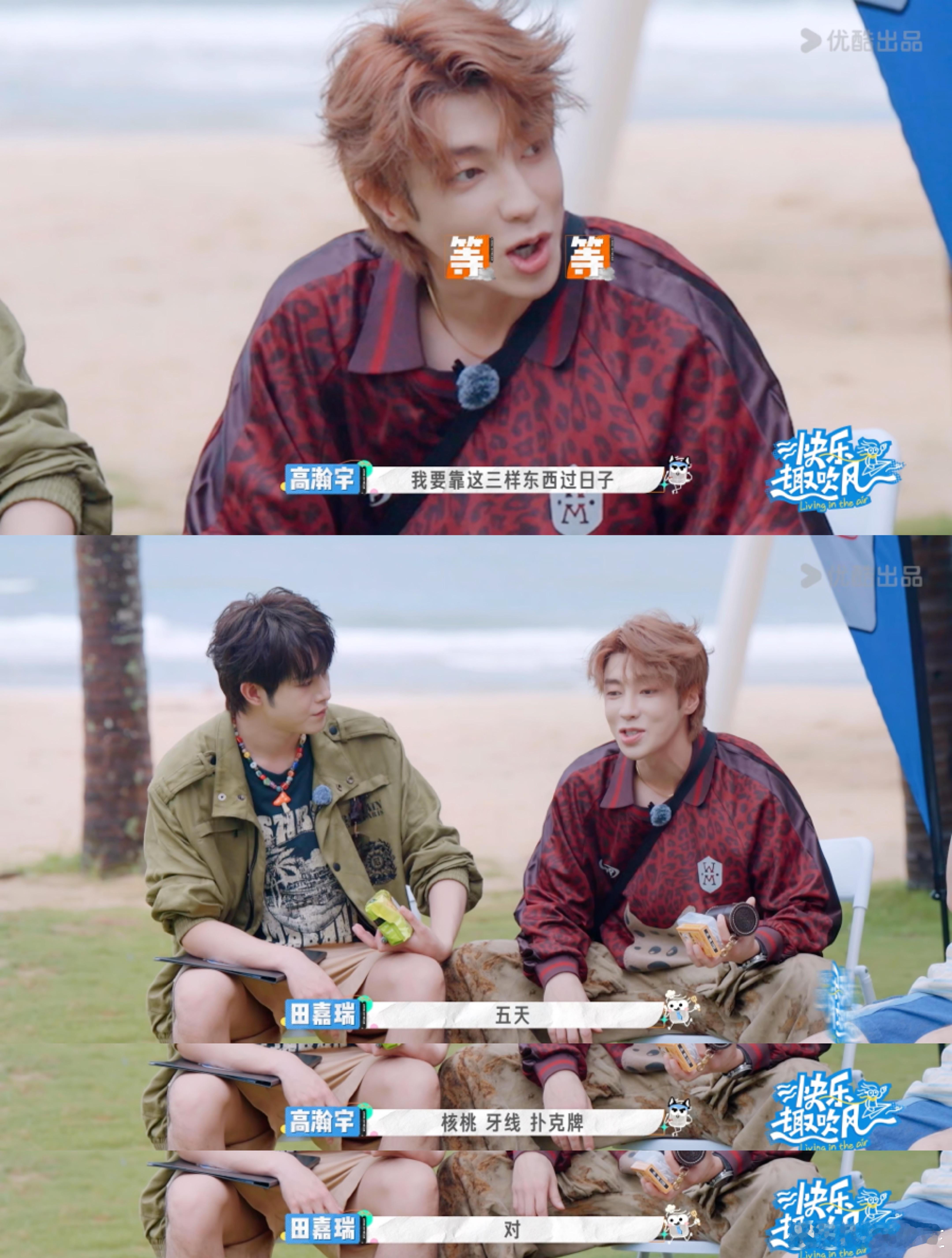 高瀚宇嘴叼牙线光腚玩扑克 追《快乐趣吹风》时,看到高瀚宇面对没剩多少的行李额度,还一门心思给大家准备牙线、扑克牌,我真的又笑又佩服!这老实人属性也太明显了,换我早急着给自己抢东西了,他倒好,满脑子都是别人,太可爱了!快乐趣吹风