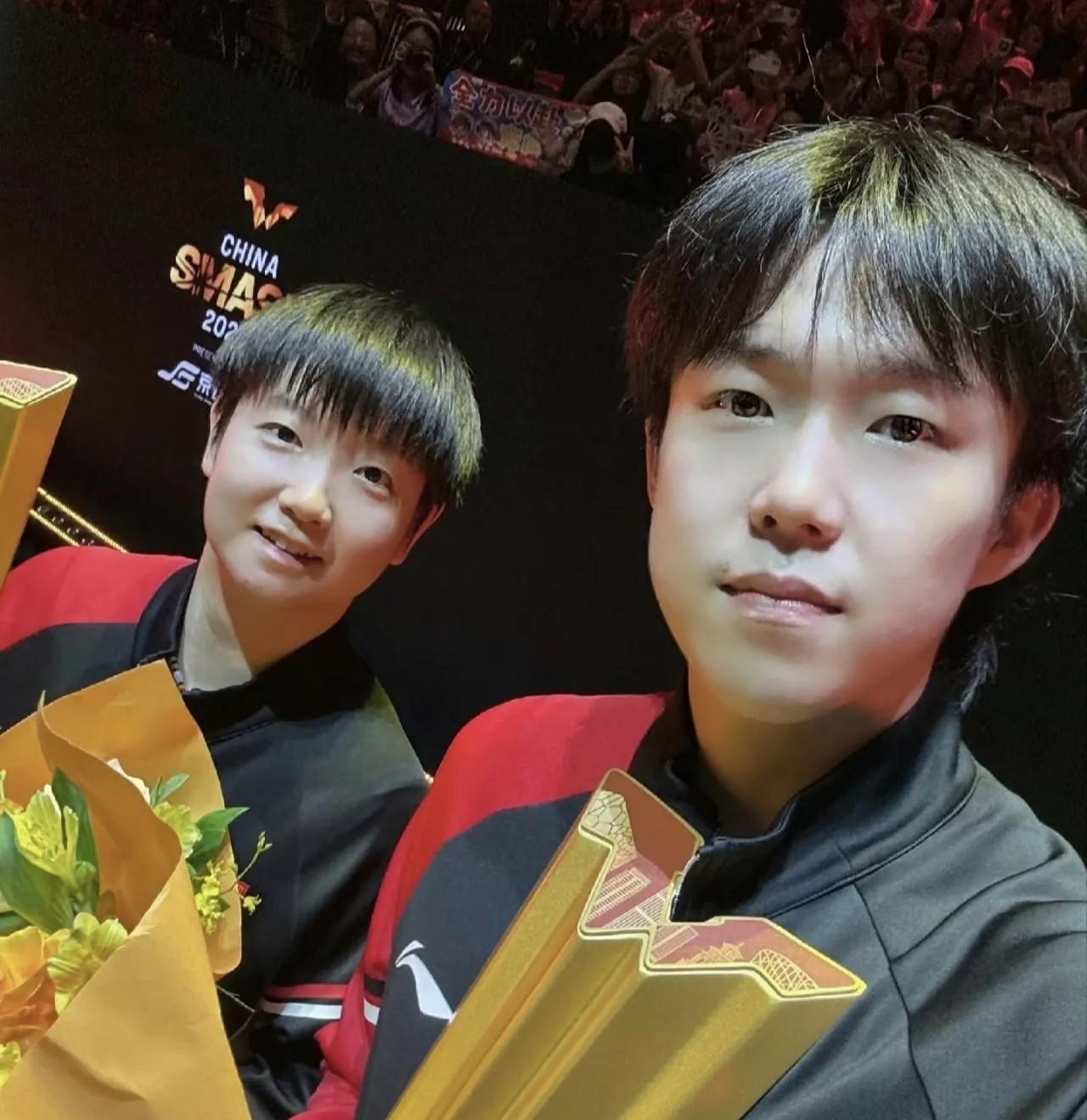 发现没有?只要哥姐拎拍子上,冠军就去不了别人家[捂脸] 莎姐:奖杯太重,小莎我拿着太费劲顾不上拍照啦,头哥你来! 头哥:好嘞,