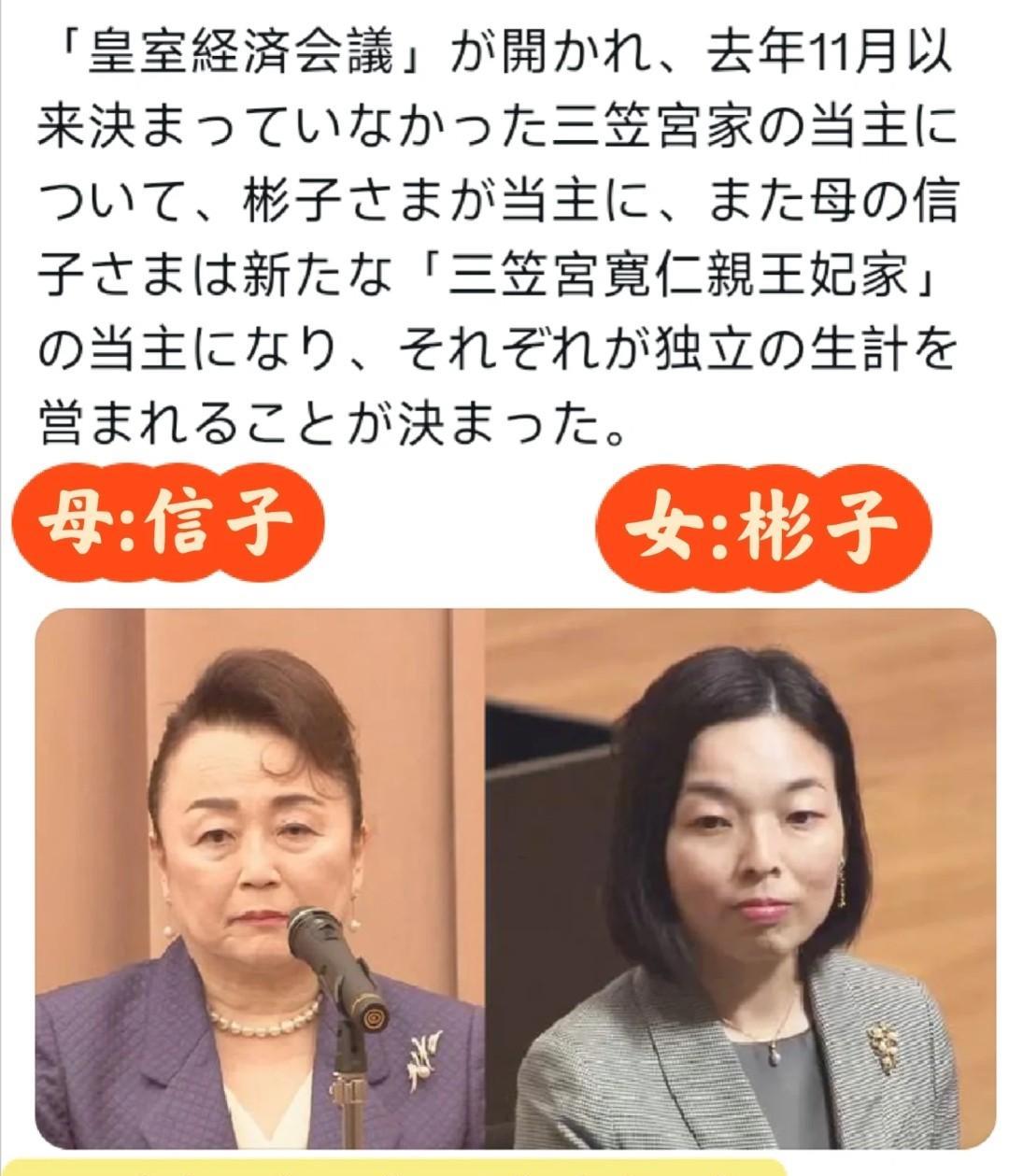日本皇室母女宫斗:麻生信子不算失败 日本三笠宫宽仁亲王的遗孀麻生信子和女儿彬子的宫斗划下帷幕了。 众所周知,信子和女儿彬子一向不和,在继承三笠宫家主这件事上,母女俩也打得不可开交。经过多方努力后,日本皇室经济会议宣布,女儿彬子继承父亲宫号,成为三笠宫家主,而母亲信子则自己开张,成为宽仁亲王王妃家家主,母女俩各干各的。 因为出现了女性继承宫家,这算是开了个好头,但对日本民众来说,皇室花的税金又多了一份。就彬子继承宫家来看,所谓皇室典范都是可以改的,所以德仁要不要为女儿努力一把呢?
