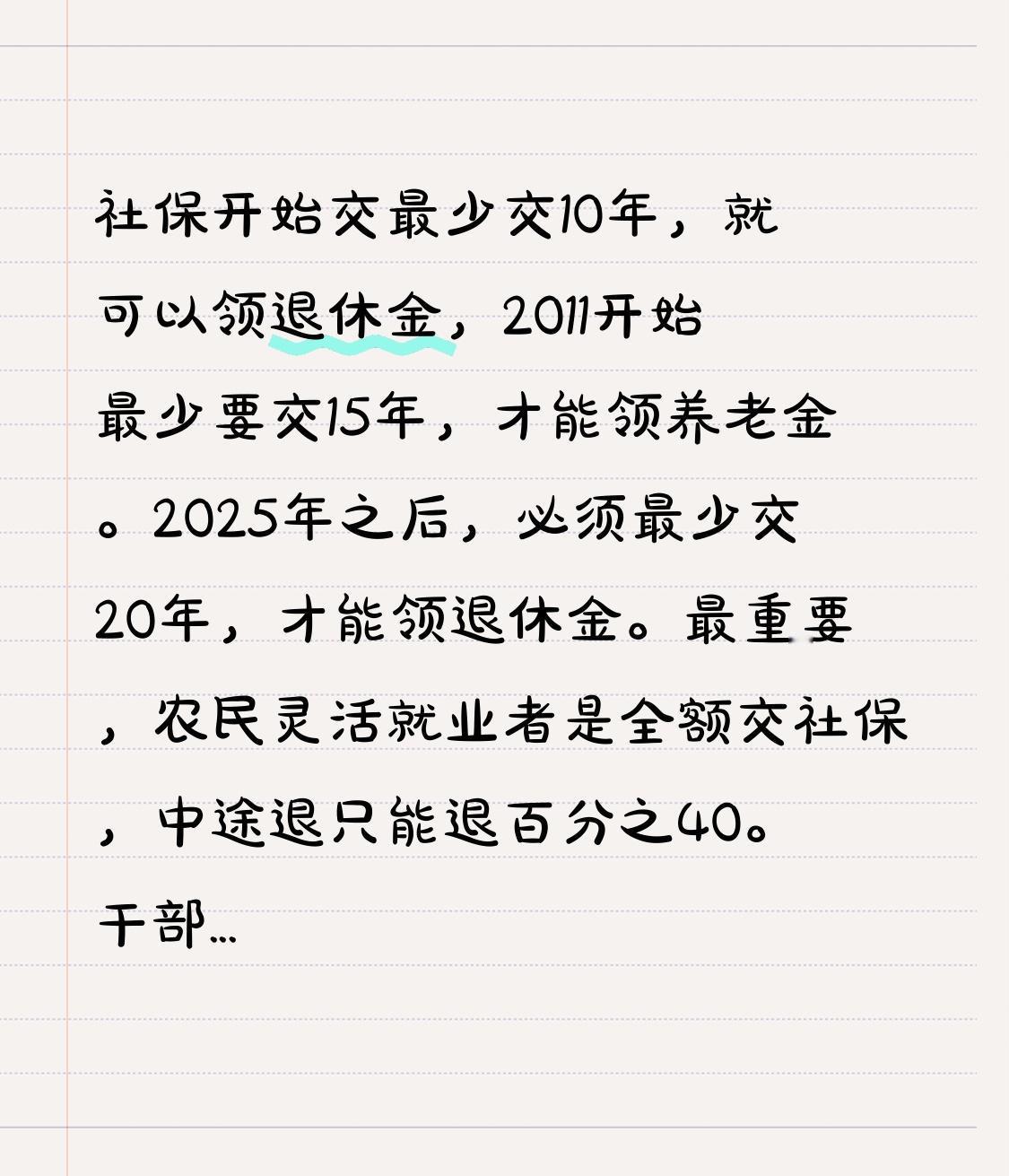 社保刚开始缴纳时,最少交10年就可以领取退休金。 从2011年起,最少需交15年才能领取养老金。 2025年之后,必须最少交20年,方可领取退休金。 最为关键的是,农民和灵活就业者需全额缴纳社保,若中途退保,仅能退还百分之40。 干部和工人自己缴纳百分之8,国家补贴百分之20,大部分社保费用由国家补贴。【企业补贴还是国家的钱,全民所有制】