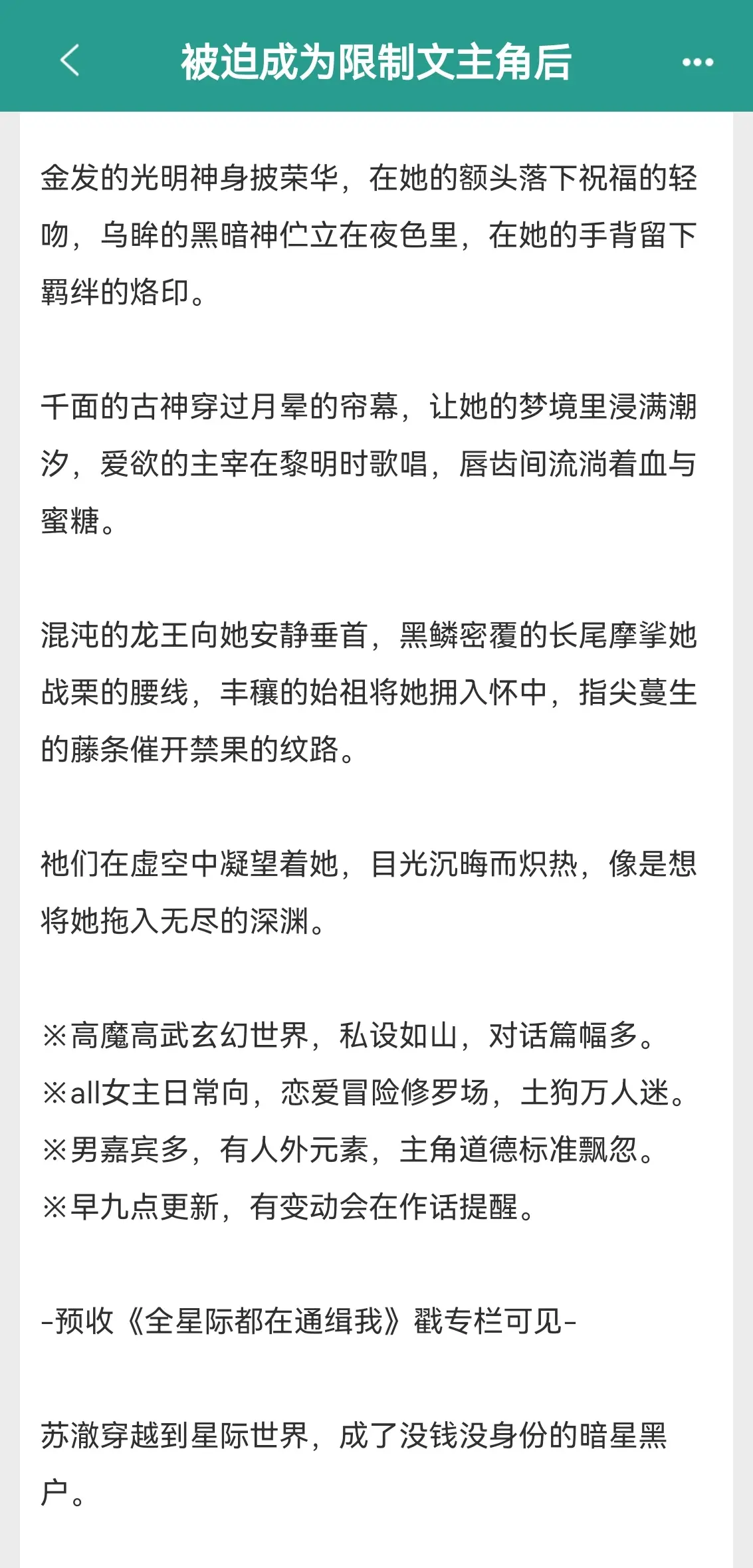 被迫成为限制文主角后。晋江每日推文 作者ps: 高魔高武玄幻世界,私设如山,对话篇幅多。 all女主日常向,恋爱冒险修罗场,土狗万人迷。 男嘉宾多,有人外元素,主角道德标准飘忽。 早九点更新,有变动会在作话提醒。